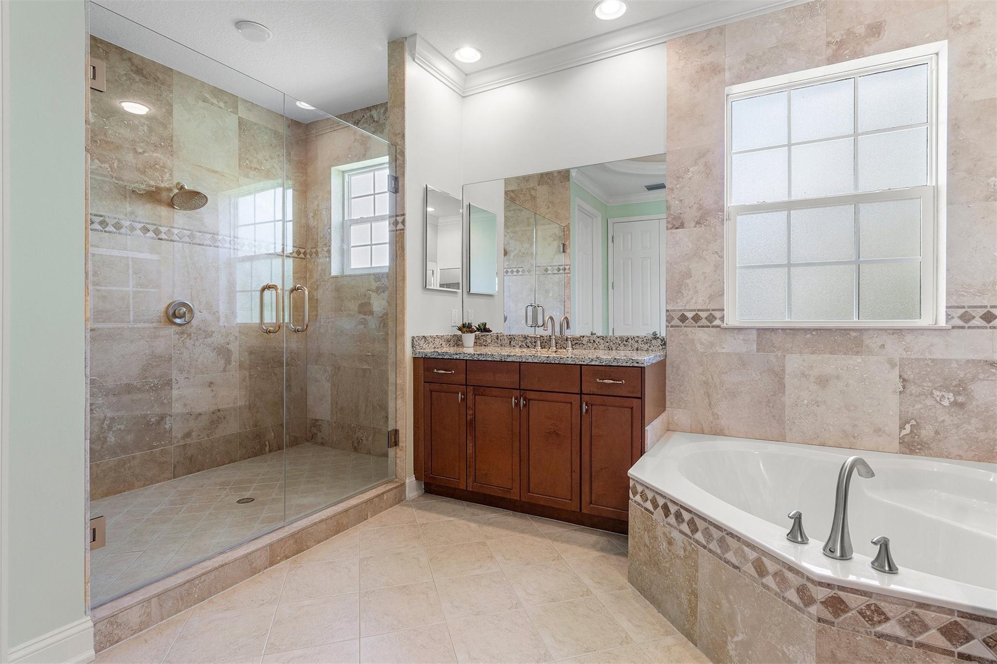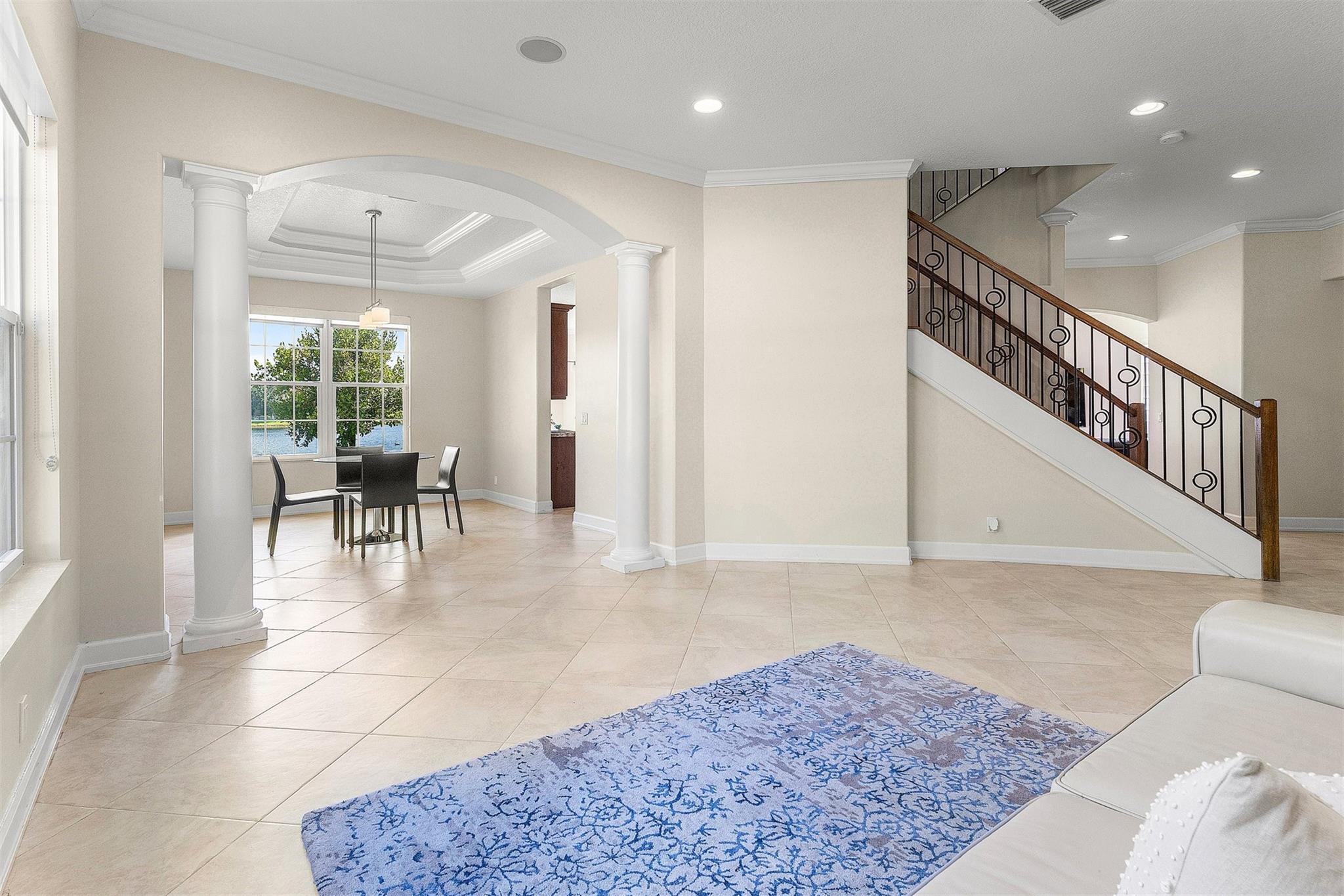 Stunning 5-bedroom, 4.5-bath lakefront home in a gated community with resort-style amenities. Enjoy wide water views and a light-filled layout featuring ceramic tile floors, knockdown ceilings, raised panel doors, and elegant Colonial trim. The gourmet kitchen offers European-style cabinetry, granite countertops, and stainless steel appliances. Upstairs, the spacious primary suite boasts a private lakefront balcony, custom closets, a sitting nook, and a spa-inspired bath with dual sinks, soaking tub, and separate shower. Generously sized bedrooms and open living areas make this home perfect for both everyday living and entertaining.
