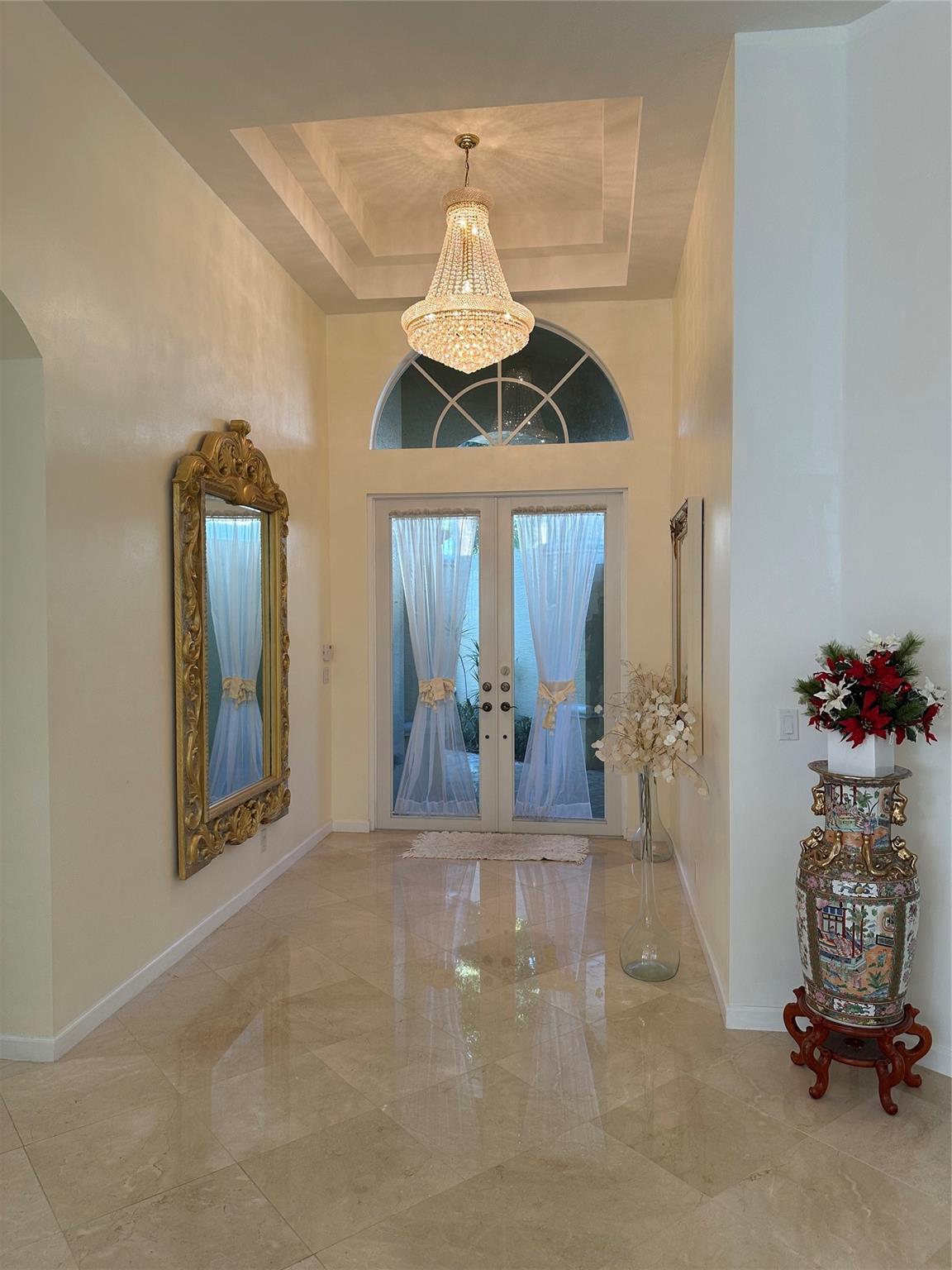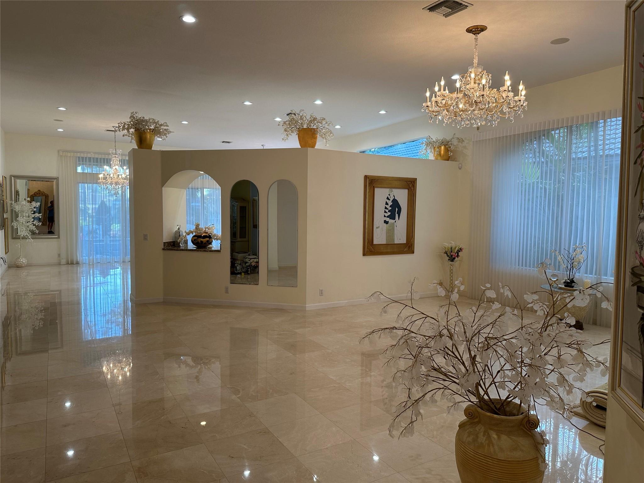 Welcome to this stunning 4/3.5 residence located in Manchester Lakes at Wycliffe Golf & C.C Perfectly positioned on a quiet cul-de-sac lined with palm trees, this home offers a rare blend of luxury, elegance, and vibrant C.C living. Step through the double-door entry into a spacious open floor plan featuring marble floors throughout the main living areas. The kitchen boasts white cabinetry, granite countertops, and a seamless flow into the formal dining and family rooms, with a view of the golf course. The primary suite offers his and hers walk-in closets, dual vanities, Roman soaking tub and separate shower. A 4th bedroom currently serves as a home office, providing flexibility for your lifestyle. Also includes accordion shutters, newer A/C and timeless architectural details throughout.