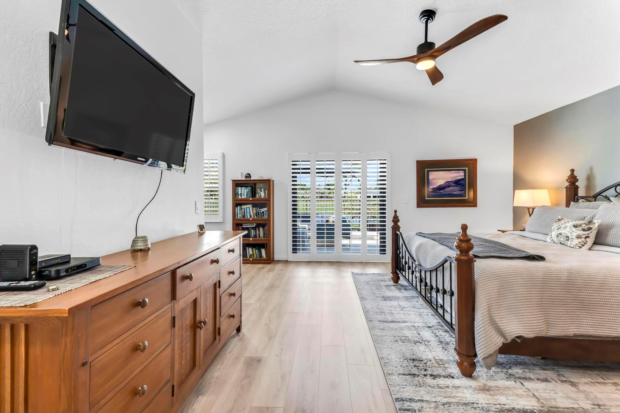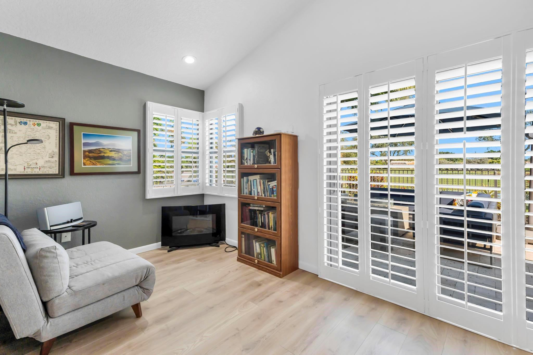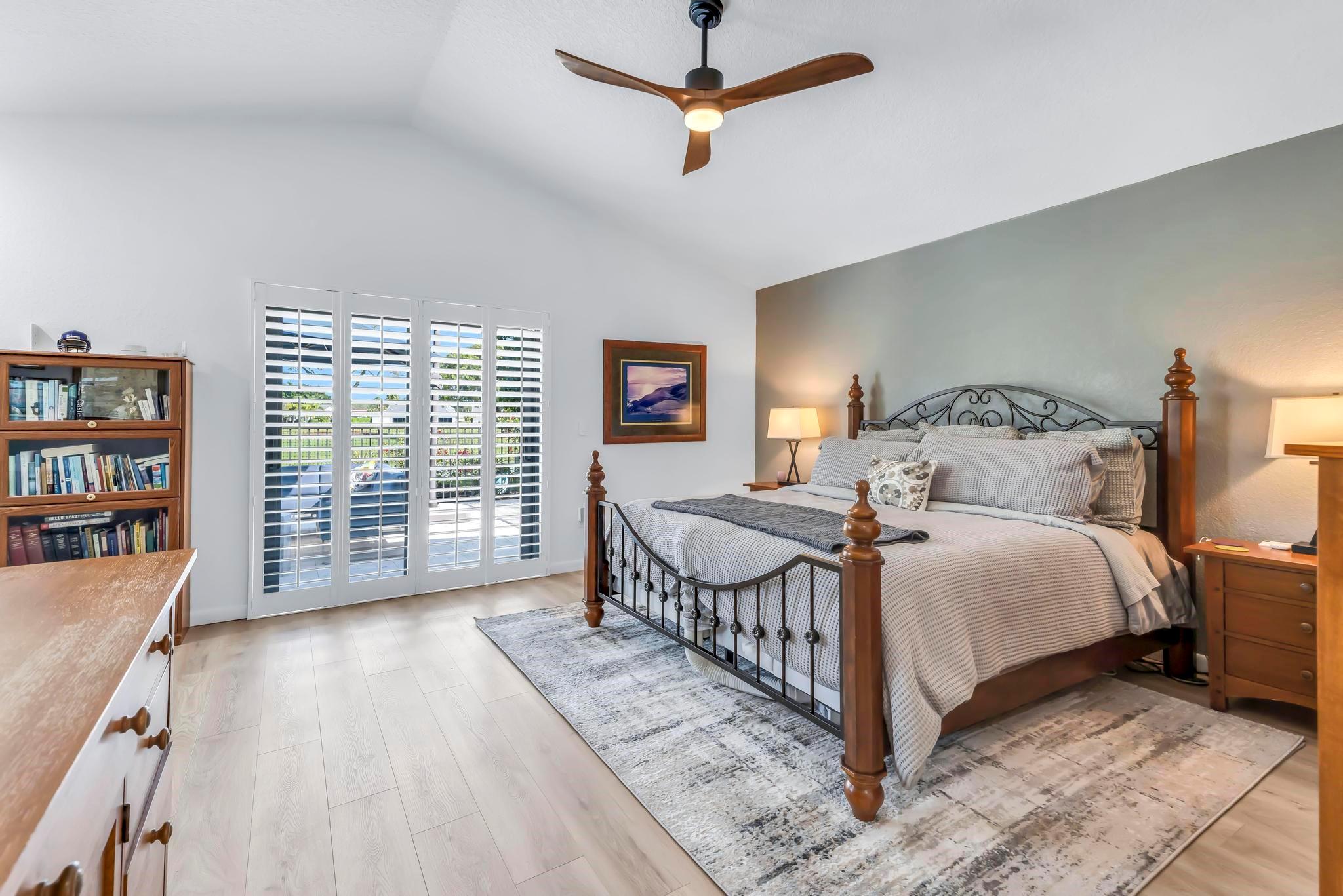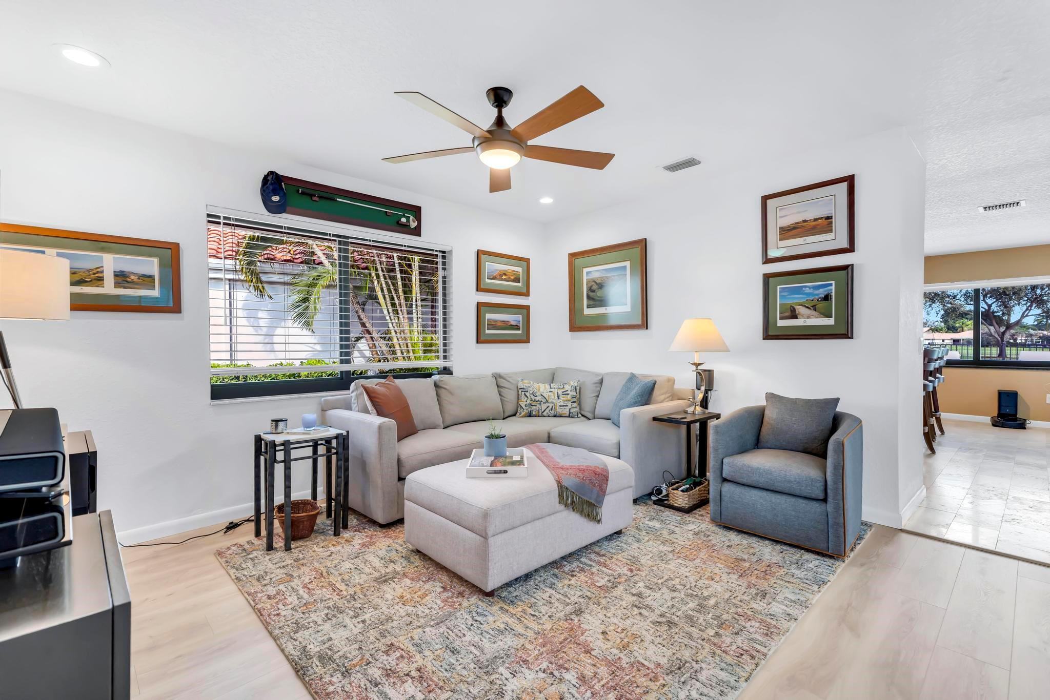 This practically new 3-bedroom, 3-bath pool home offers stunning golf and water views and exceptional upgrades throughout. Features include a new metal roof, two newer A/C units, impact windows, doors, and garage doors, plus an A/C-equipped golf cart garage. Enjoy a heated pool with three automatic screen enclosures, a large travertine paver patio and driveway, and automatic shades. Inside, the custom wood kitchen boasts stainless steel appliances, new luxury vinyl flooring runs throughout, and the primary suite includes a bonus sitting area. A rare blend of luxury, comfort, and peace of mind. Boca Woods features two champioship golf courses with stunning practice facilities, pickle ball, clay tennis courts, two restaurants, bocce ball & state of the art spa and gym facilities.