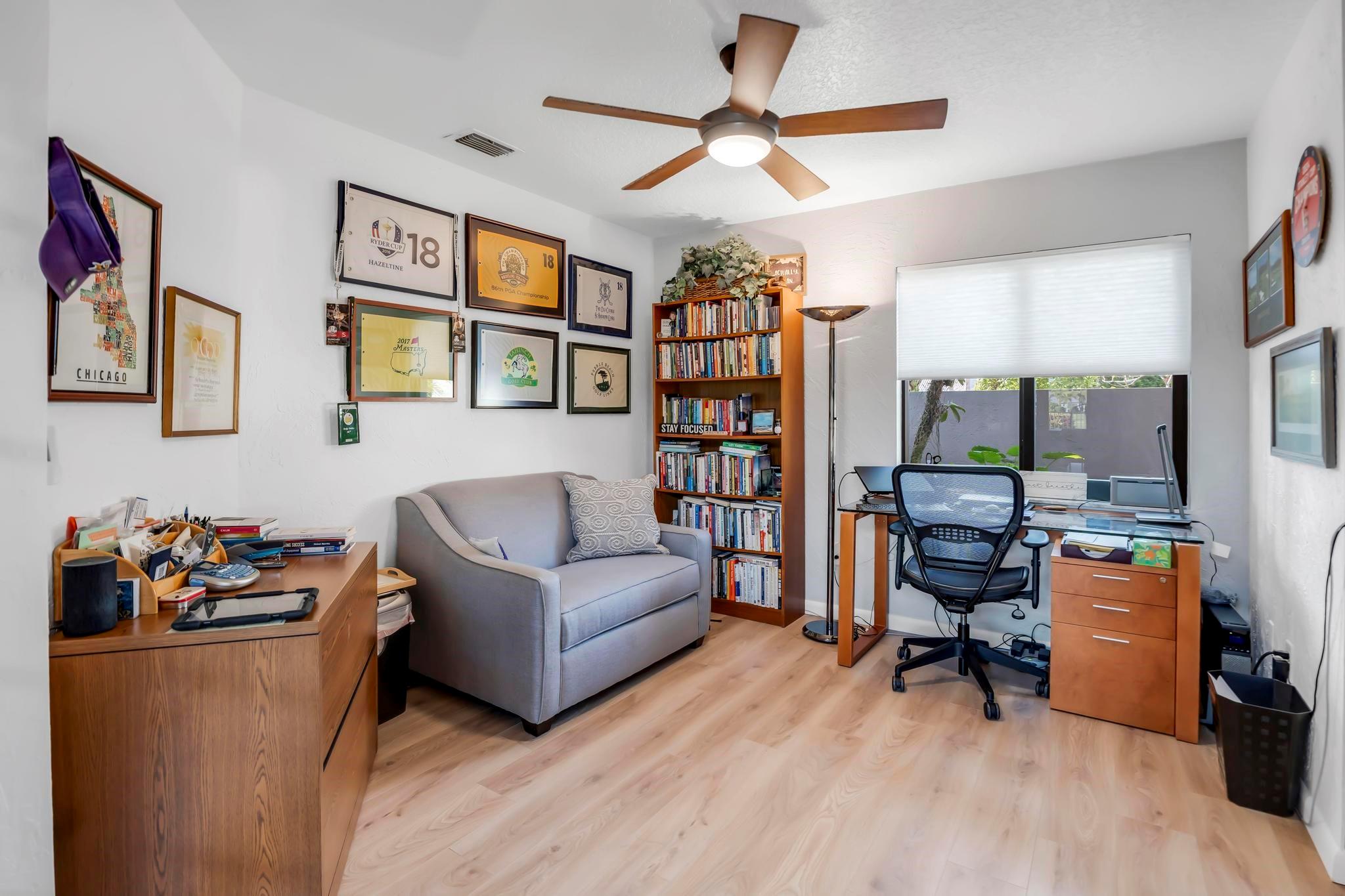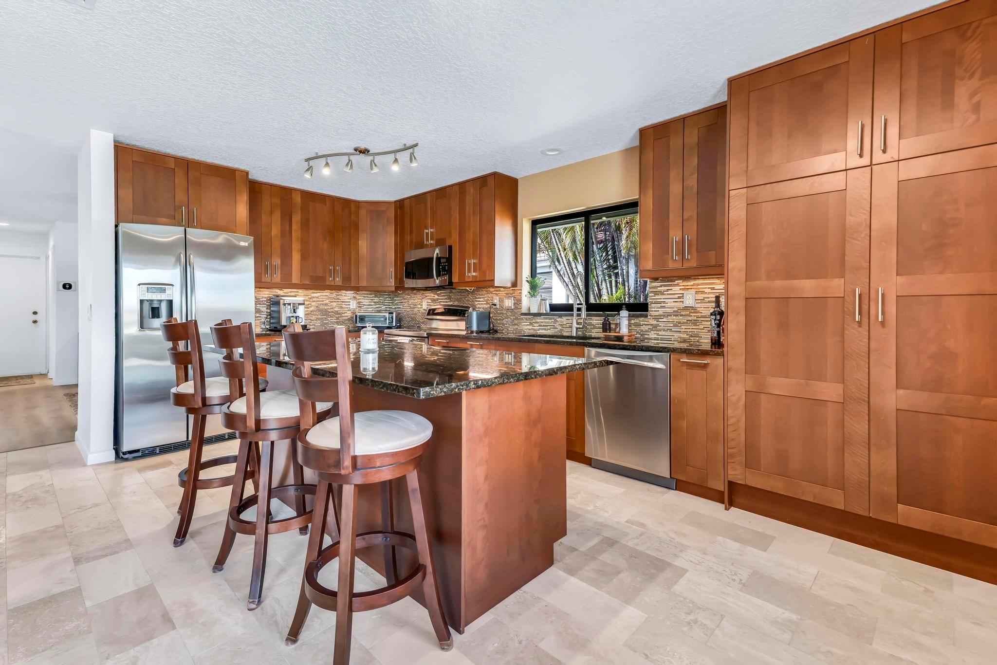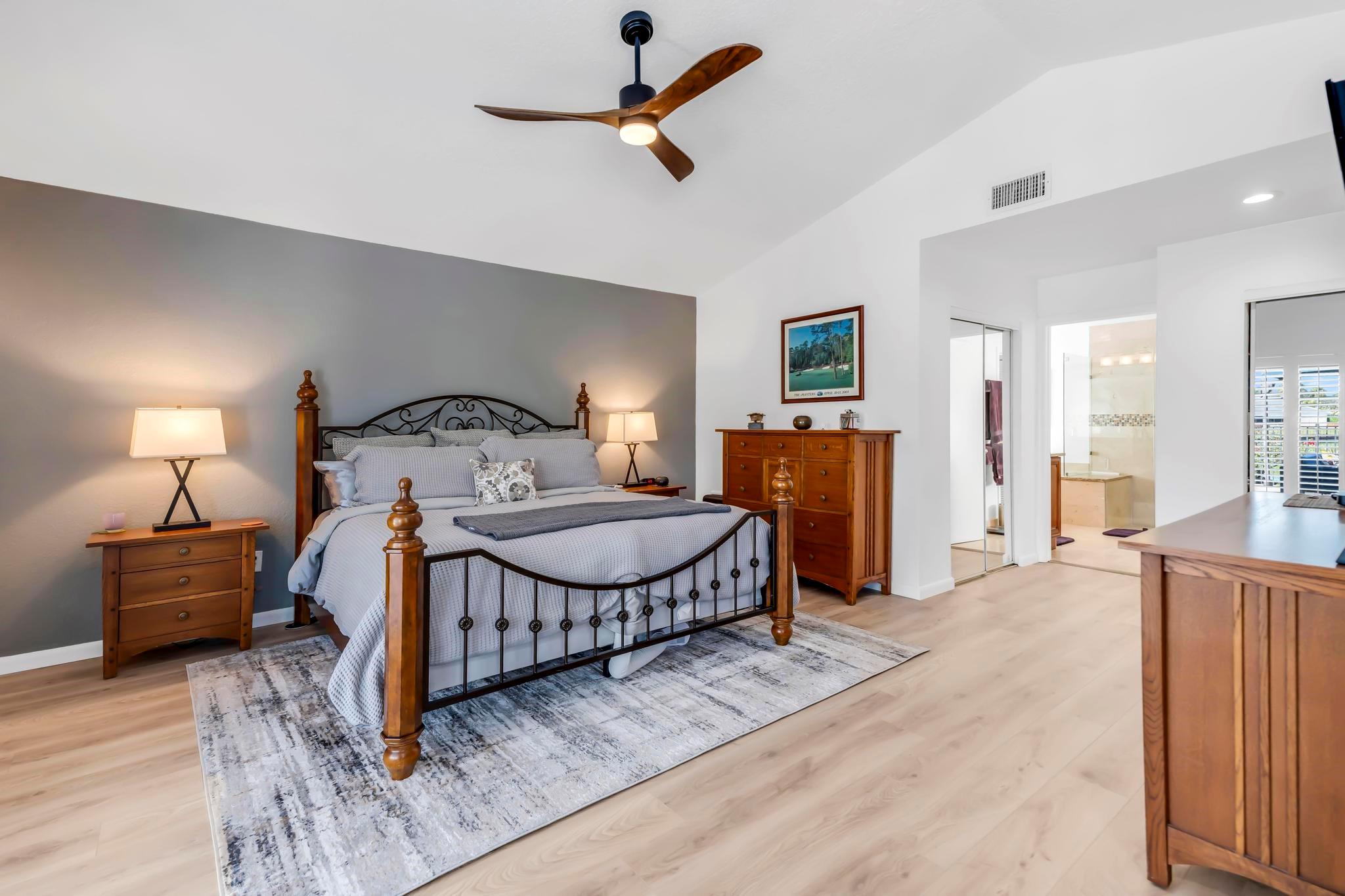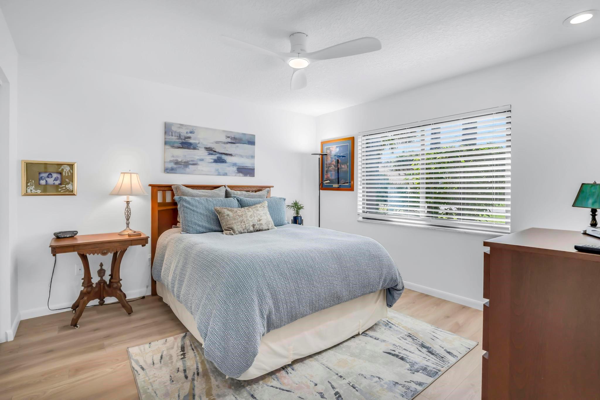 This practically new 3-bedroom, 3-bath pool home offers stunning golf and water views and exceptional upgrades throughout. Features include a new metal roof, two newer A/C units, impact windows, doors, and garage doors, plus an A/C-equipped golf cart garage. Enjoy a heated pool with three automatic screen enclosures, a large travertine paver patio and driveway, and automatic shades. Inside, the custom wood kitchen boasts stainless steel appliances, new luxury vinyl flooring runs throughout, and the primary suite includes a bonus sitting area. A rare blend of luxury, comfort, and peace of mind. Boca Woods features two champioship golf courses with stunning practice facilities, pickle ball, clay tennis courts, two restaurants, bocce ball & state of the art spa and gym facilities.