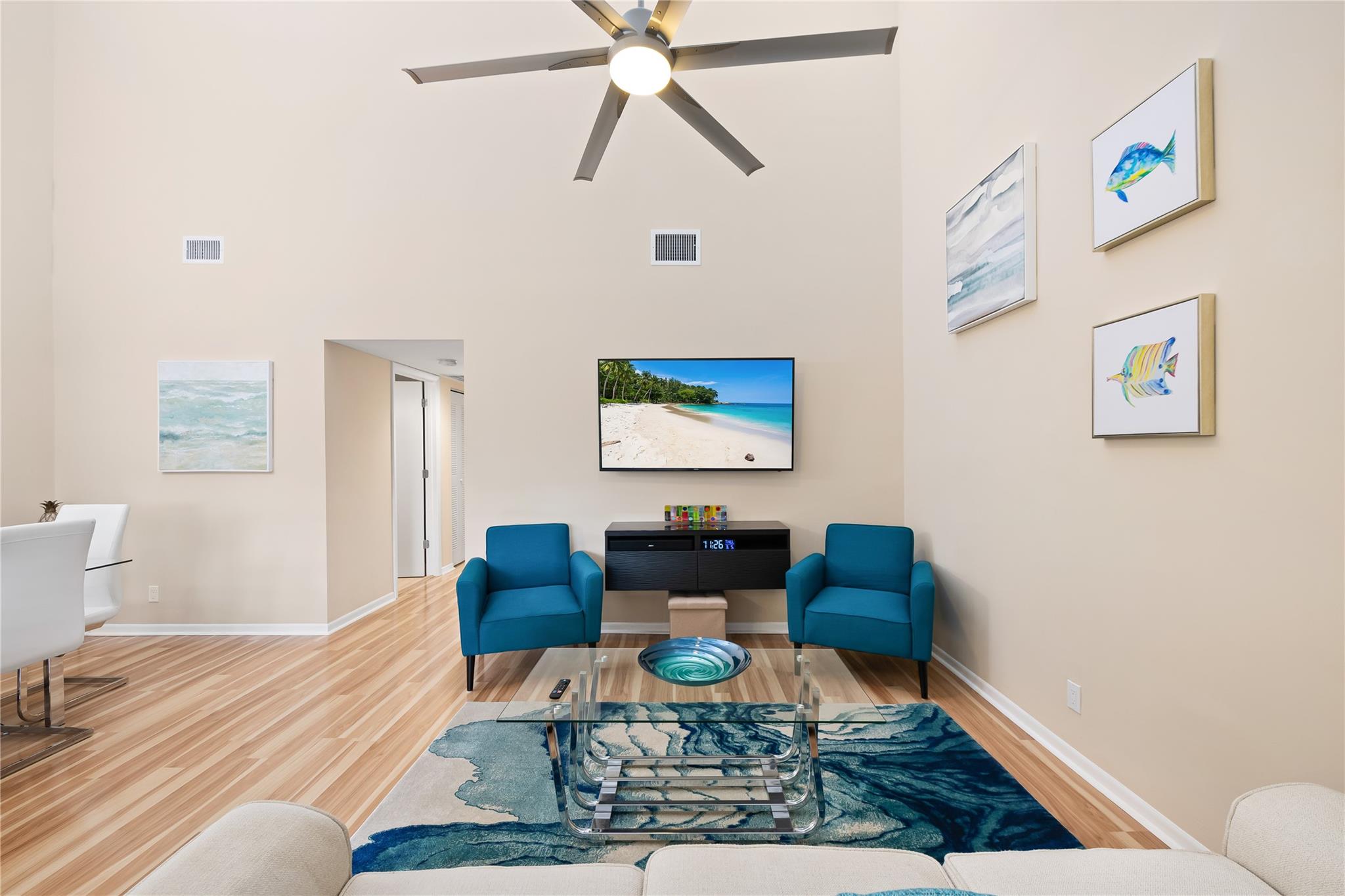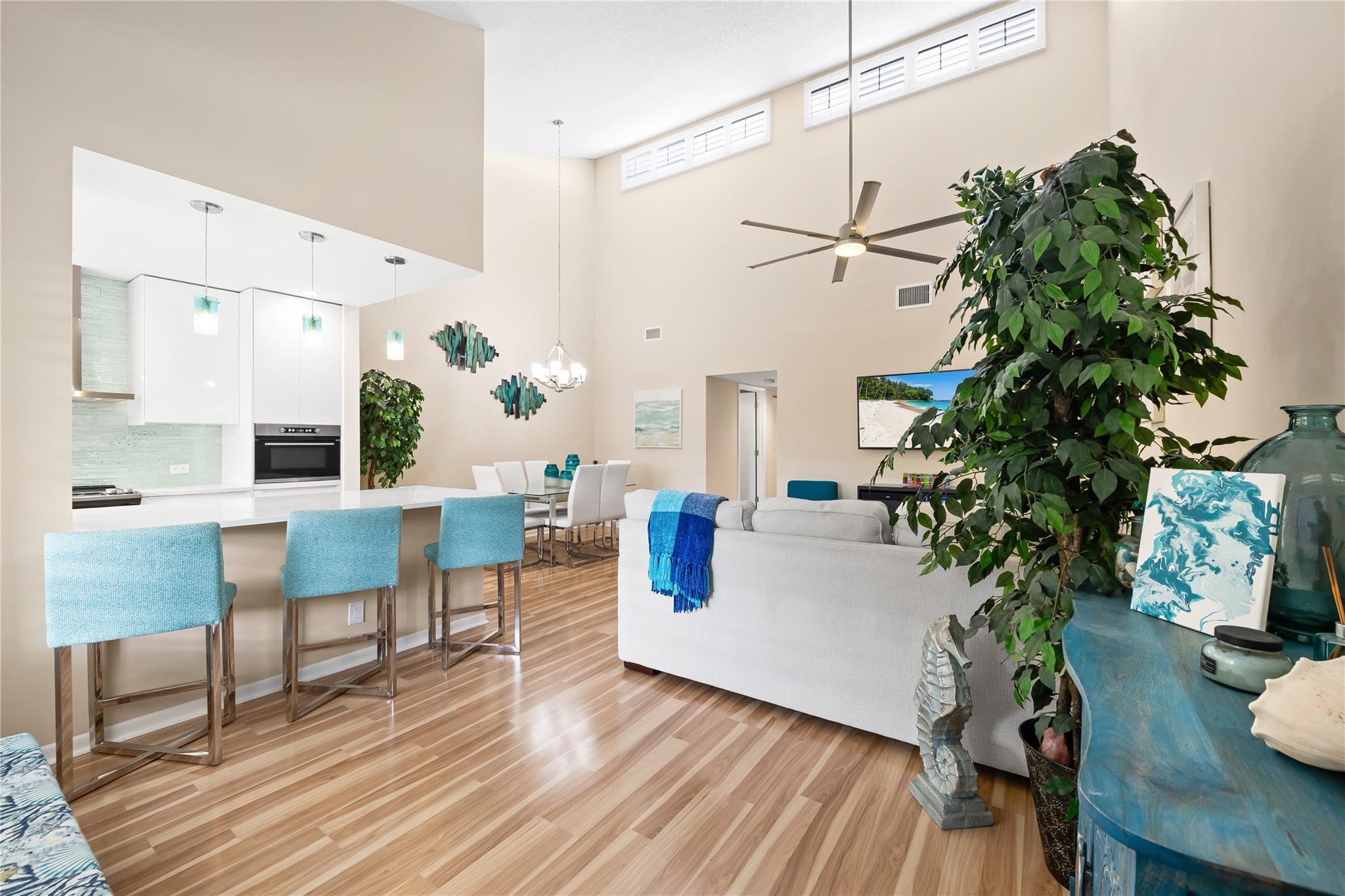 Beautiful 2-bedroom, 2-bath villa with updates throughout, featuring an open floor plan filled with natural light. The newer kitchen offers quartz countertops and stainless steel appliances, and flows seamlessly into the main living spaceperfect for everyday living. Step through the impact sliding doors to a private screened-in patio, ideal for relaxing outdoors. The home features vaulted ceilings, a tankless water heater, and a full-size washer and dryer conveniently located in the unit. All windows are impact-rated or equipped with accordion shutters for added peace of mind. Centrally located near highways, beaches, shopping, and restaurants. This active 55+ community offers wonderful amenities including a clubhouse, swimming pool, tennis courts, and pickleball. Roof replaced in 2022.