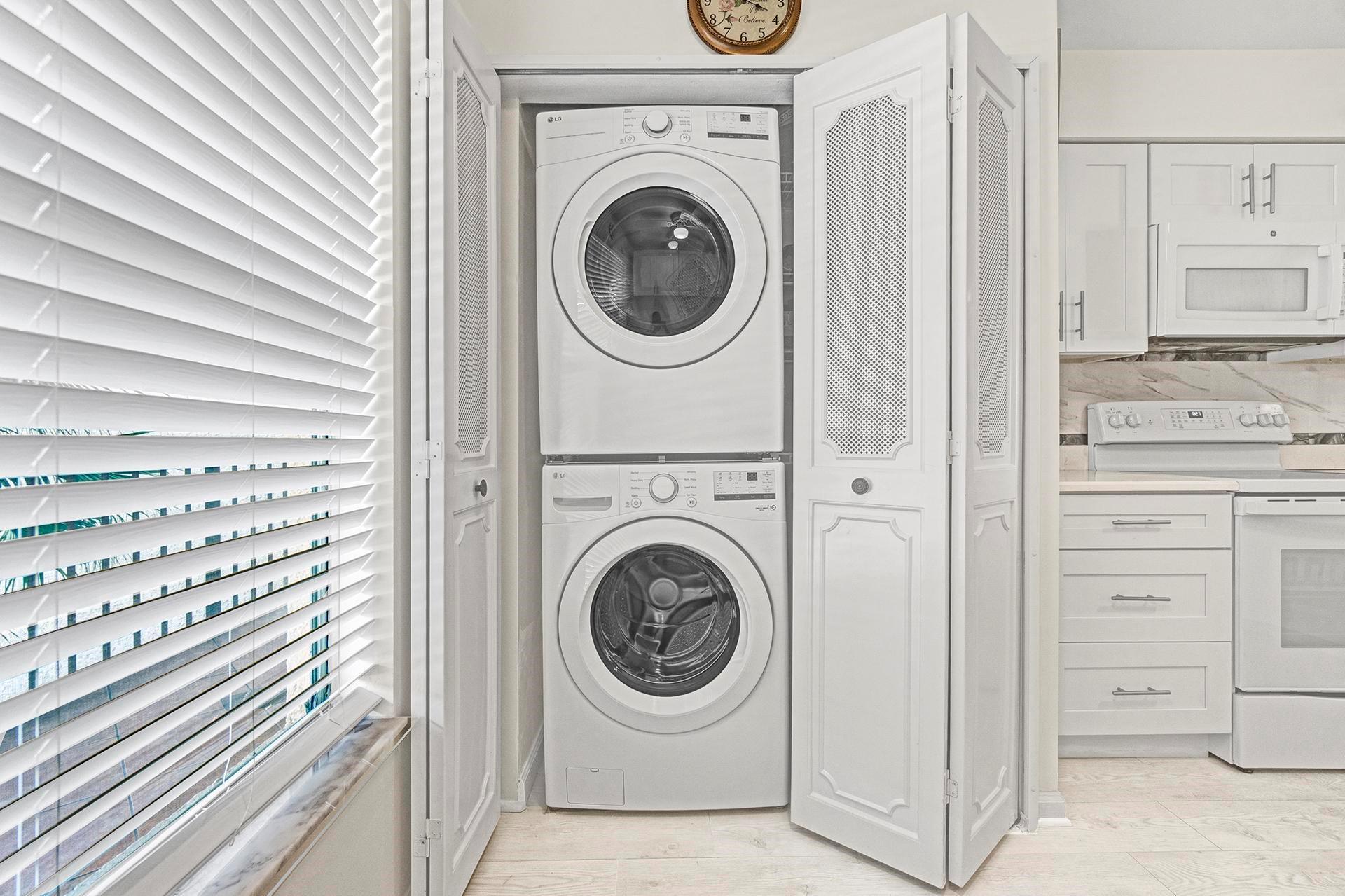 Beautiful, light, bright condo home in pretty Bonaire. Fully remodeled 2 bedrooms and 2 baths WATER view with large balcony. Great closet space in both bedrooms with walk-in closet and water view in primary. AND can be fully furnished! Large remodeled eat-in kitchen with pretty backsplash, countertops and cabinets, and new in-unit stackable full-size Washer/Dryer and new tankless hot water heater. You'll love the large lakeview balcony complete with porch swing and accordion shutters! Bonaire is well-run and has completed all inspections! Take a dip by the community pool just one building away, or get fit at the gym! Bluestream cable w/ DVR and wifi router, water, sewer, garbage incl. On-site management. Maint fees just reduced too!