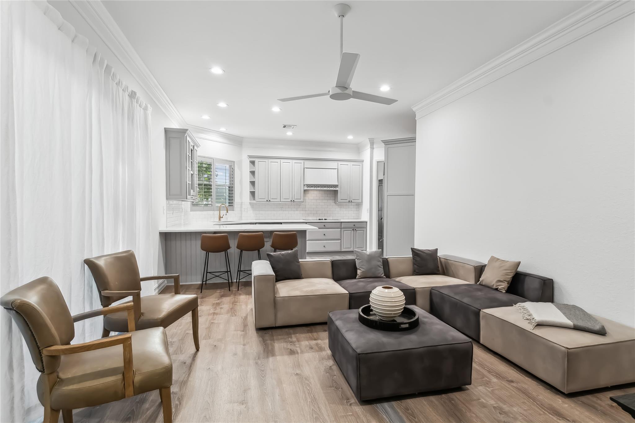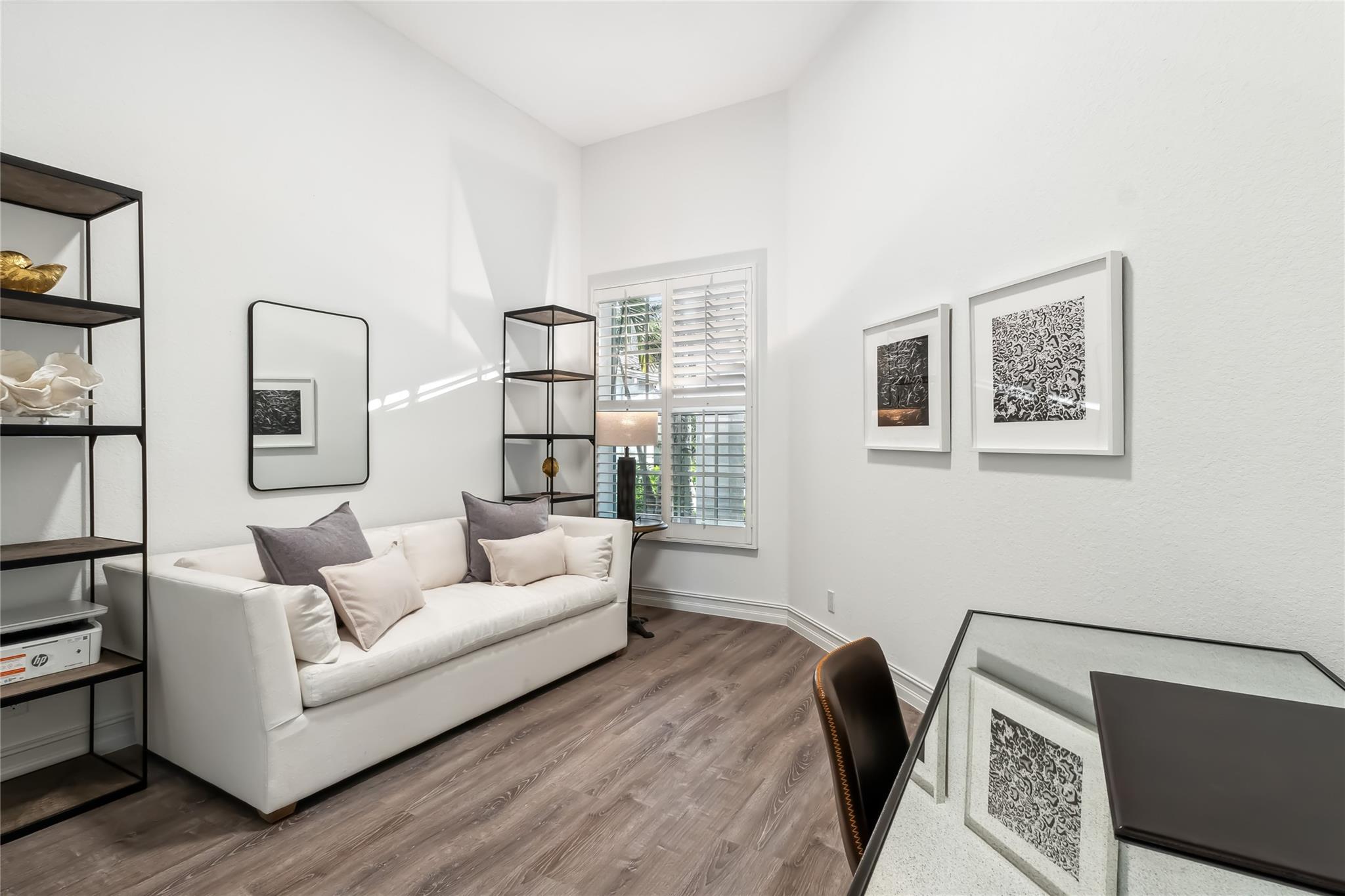 Updated contemporary Polo Club home featuring 3 bedrooms, 3 full and 1 half bathrooms, a 2.5-car garage, and a private pool overlooking the Cypress golf course. The 2,400-square-foot split floor plan offers a light and bright modern design with wood flooring throughout, tray ceilings with custom crown molding, a formal dining area, and a spacious primary suite with patio access. Outdoor living includes a covered patio, travertine tile pool deck, dark-tiled in-ground pool, and beautiful golf course views.