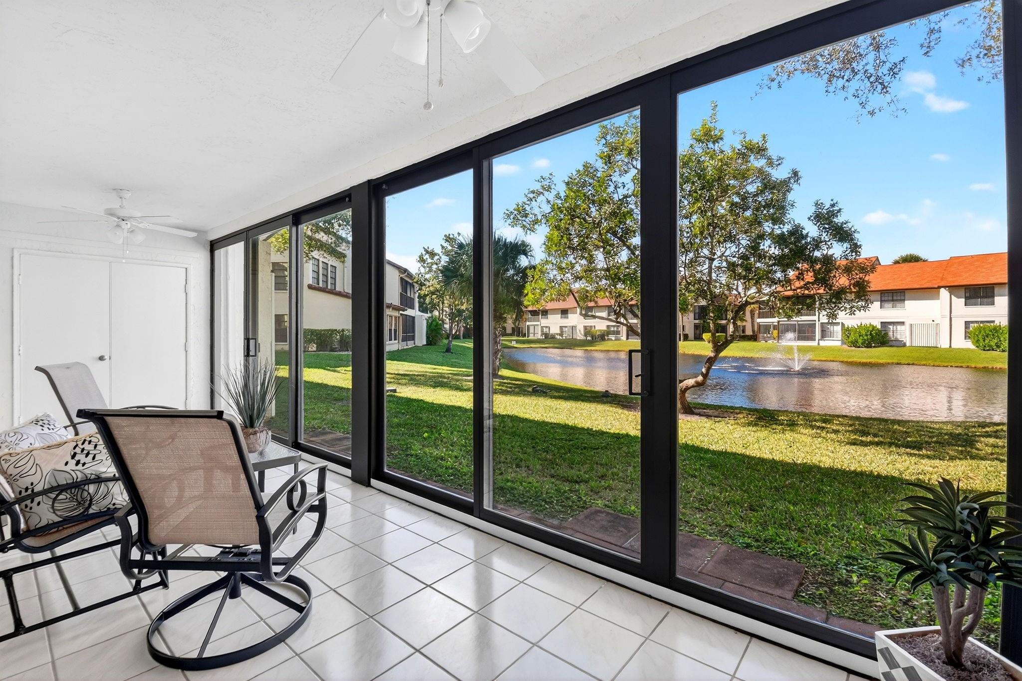 STUNNING LAKESIDE RENOVATION! 1st-floor condo offers expansive water and fountain views and a spacious 2BR + Large Den layout. Fully updated in 2025 with brand-new Luxury Vinyl Plank LVP flooring, fresh paint, and a spa-like primary bath retreat. IMPACT GLASS (2019) & New Hurricane Garage Door (2022). New AC (2022) & New Water Heater (2024). New kitchen appliances, designer flooring (2025), GARAGE: Attached garage with brand-new professional acrylic flooring (2025). Primary suite with lake views; kitchen opens to a lakefront patio. Enjoy effortless first-floor living with easy grocery access and a well-maintained community where the HOA is responsible the roof. Enjoy the peace of mind of a well-maintained community known for its incredibly friendly neighbors and welcoming atmosphere.