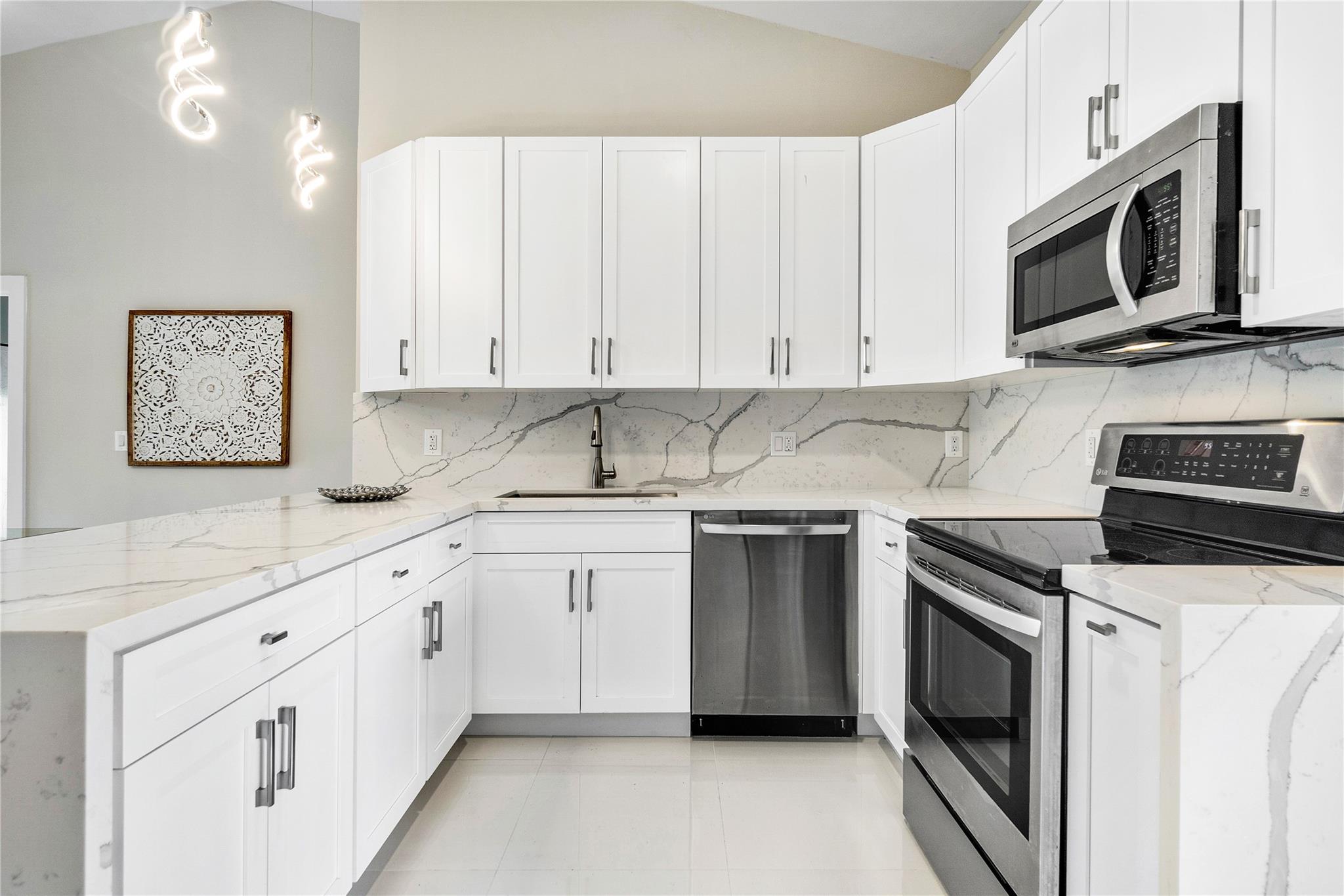 Experience modern living in this beautifully renovated 2BR, 2BA villa in a peaceful 55+ community. This stylish home features 24x24 porcelain tile floors, a designer kitchen with quartz countertops and stainless steel appliances, and updated bathrooms with new vanities, tubs, showers, and sleek tilework. Thoughtful upgrades include new lighting, switches, and outlets. A 2024 HVAC system and new tile roof provide year-round comfort. This custom renovation blends elegance, comfort, and low-maintenance living in a welcoming, active adult setting. $203 per month special assessment for roof replacements.
