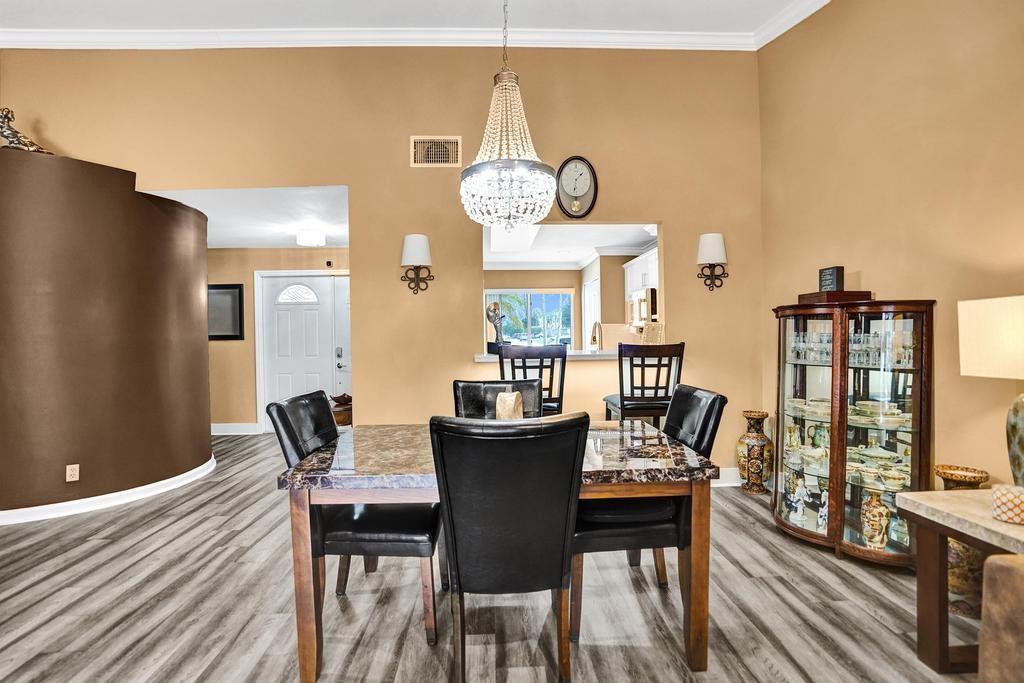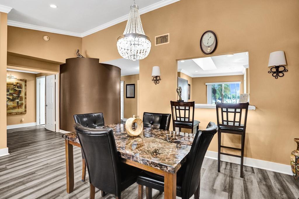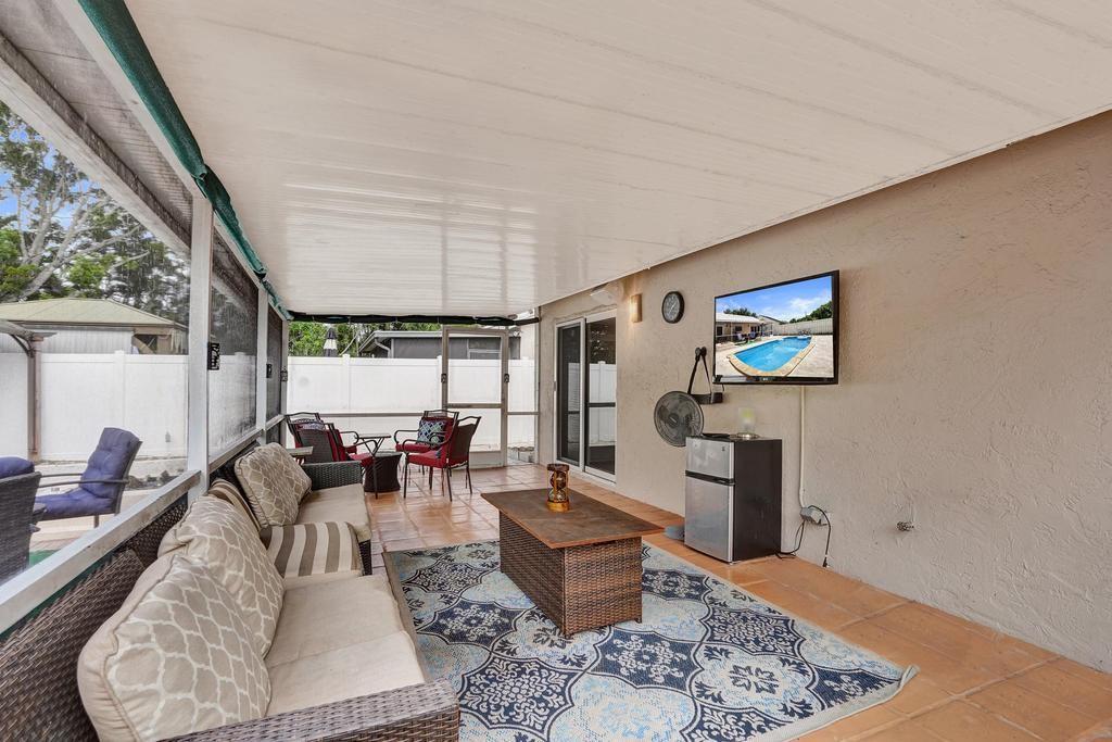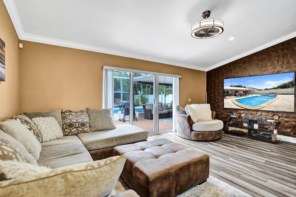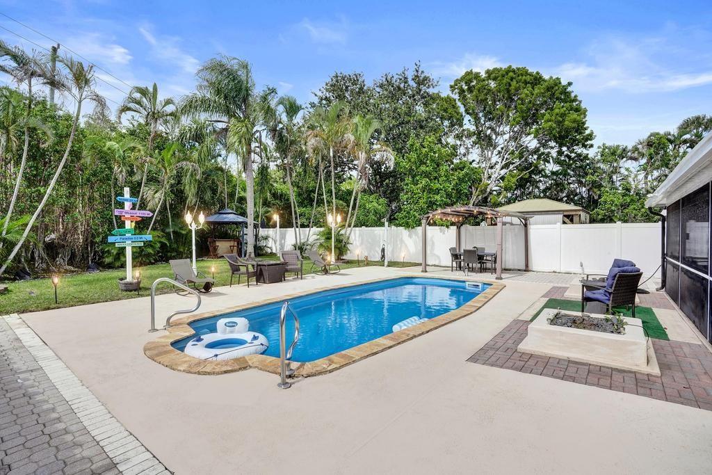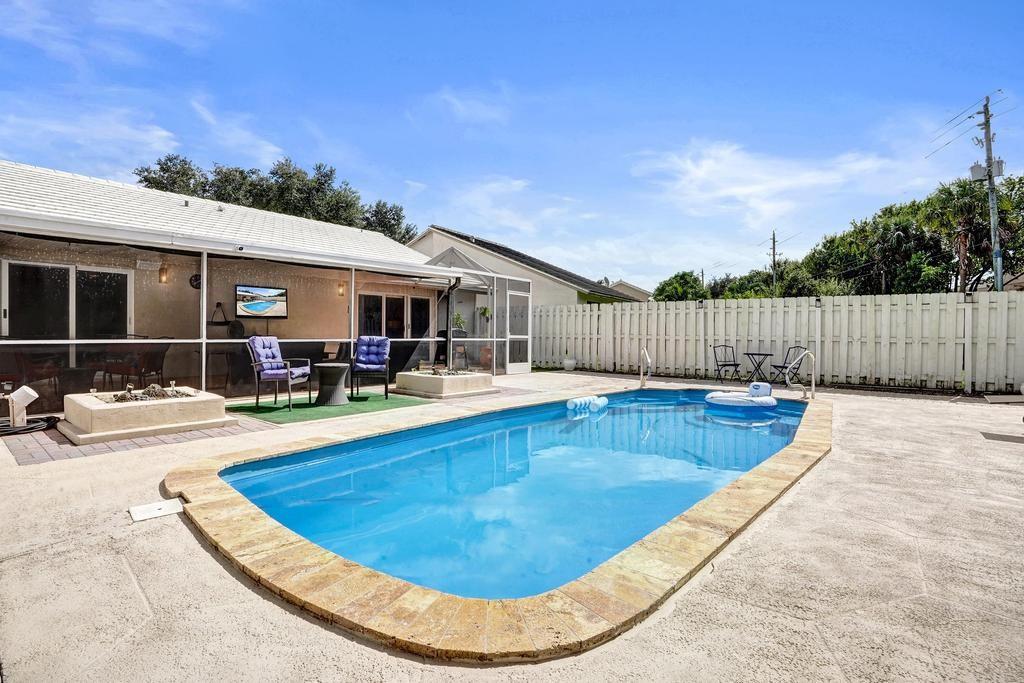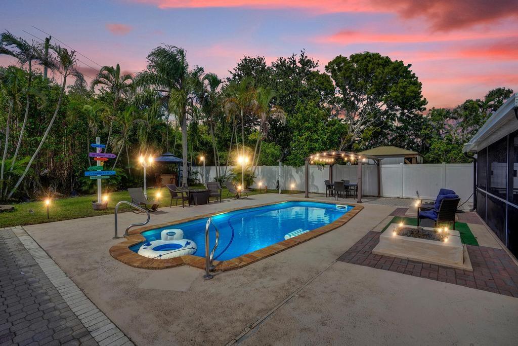 Your private entertainment paradise in Strawberry Lakes! This 3-bed, 2-bath, 2 car garage pool home. The backyard is the star, 1 of only 7 in the community with a sparkling pool, tiki hut, & plenty of space to host unforgettable gatherings. Enjoy a covered, screened patio, lush landscaping, & one of the largest lots in the neighborhood. Inside, you'll find vaulted ceilings with crown molding, recessed lighting, luxury vinyl plank flooring, a modern kitchen & white granite counters, a skylight, & stainless appliances. All windows, doors & sliders are hurricane impact. The primary suite features a double door entrance, an upgraded bathroom with white and blue subway tile, a rain shower, & dual vanities. This home is move-in-ready, ready to host your first party!
