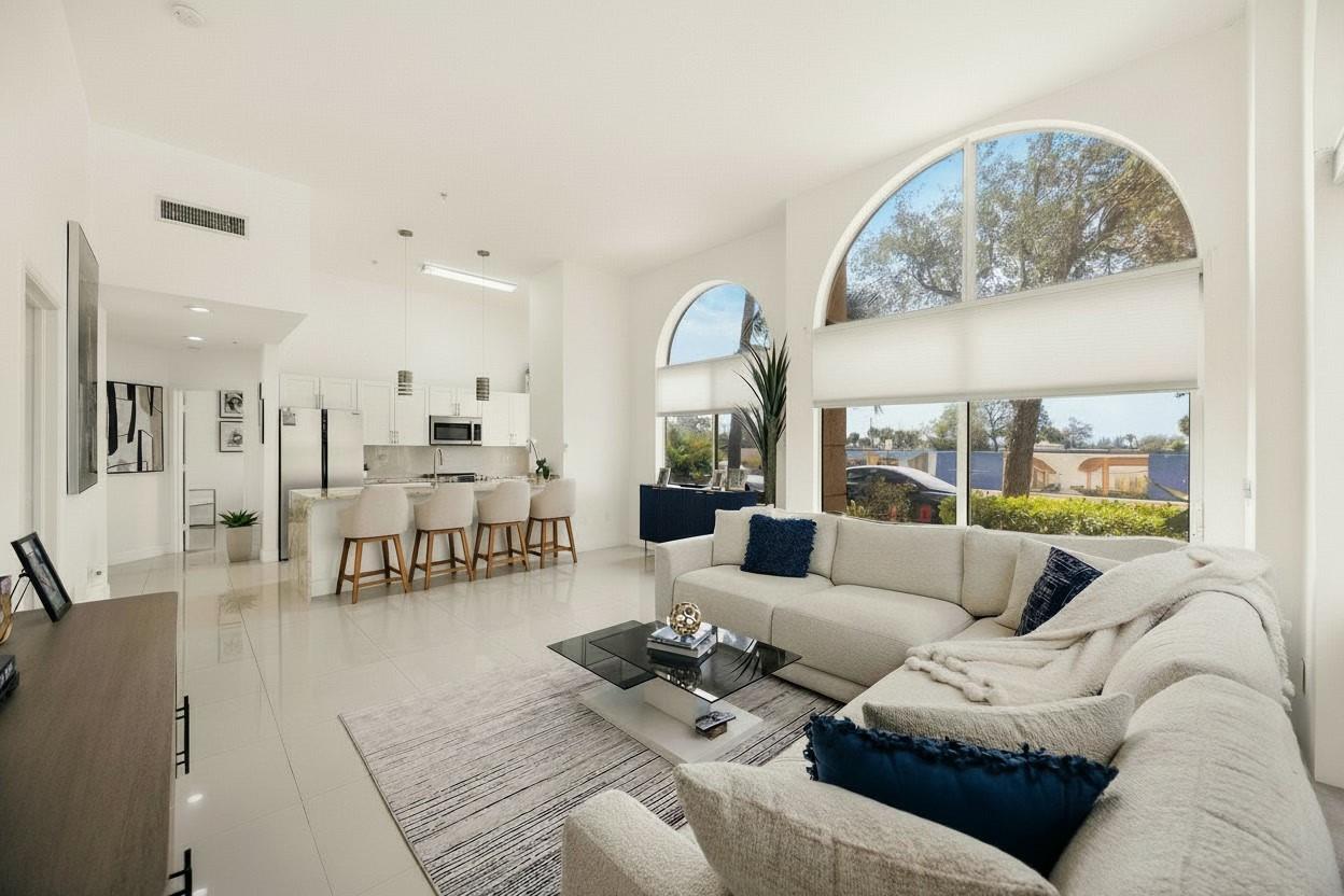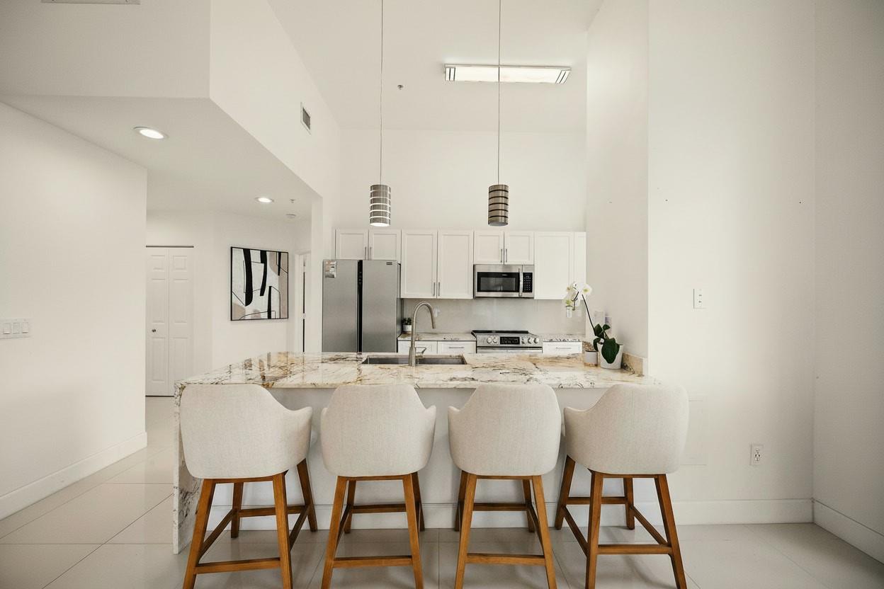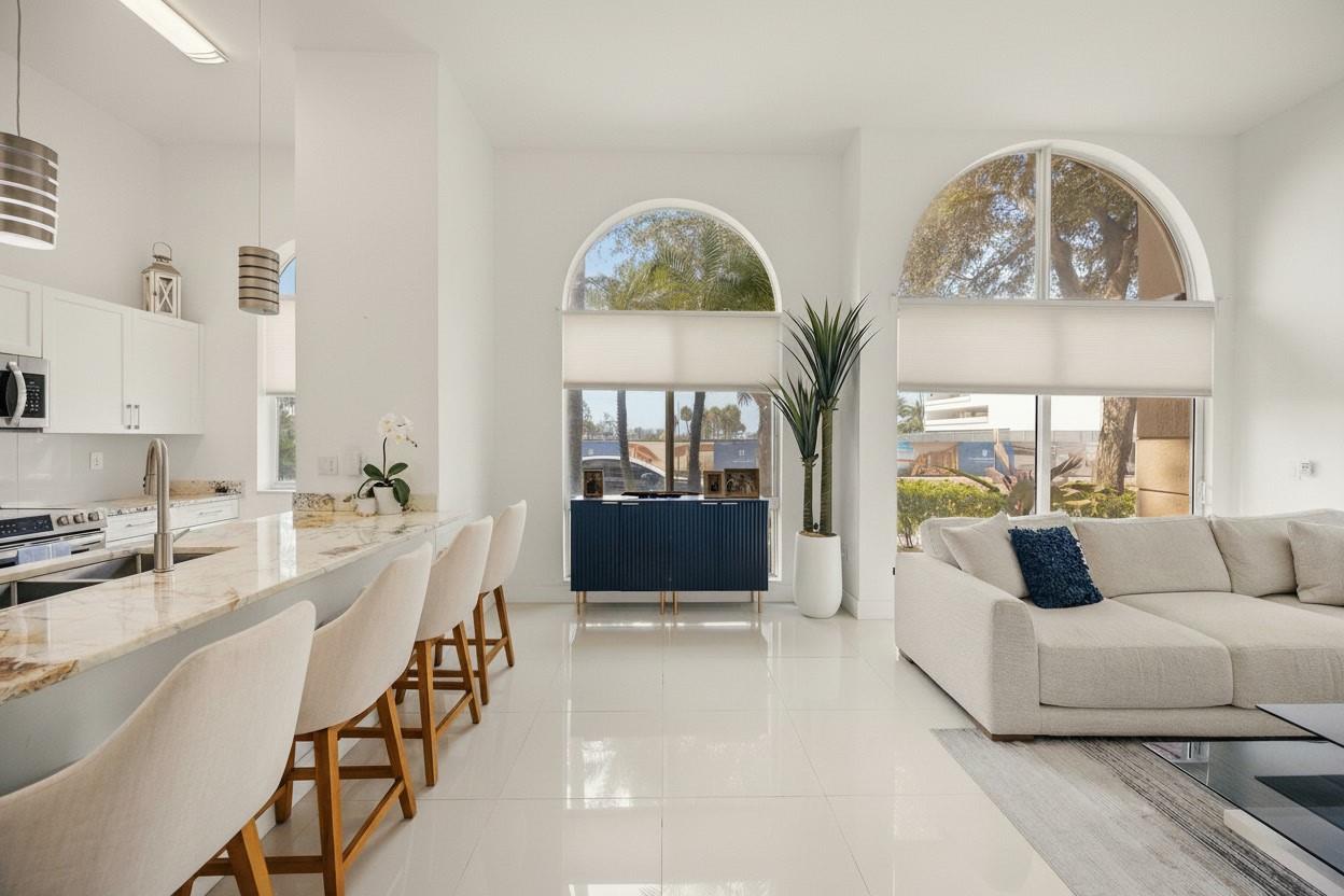 Updated 2BR/2BA corner residence with high ceilings, bright open layout and private patio. Spacious living/dining flows into a modern kitchen with quartz counters and bar seating. Fresh paint, neutral flooring, tiled baths, and Washer/Dryer included. Impact glass throughout. Building offers 24/7 concierge & onsite management, secure fob/gated entry, 2-car garage parking, bike storage, EV charging, large gym, cyber caf, club room, and resort-style pool with hot tub & grills. HOA covers water, sewer, trash, insurance, high-speed internet & DIRECTV. Flexible 7-month rentals. Prime downtown location 2 blocks to CityPlace dining, shopping, nightlife and the Kravis Center.