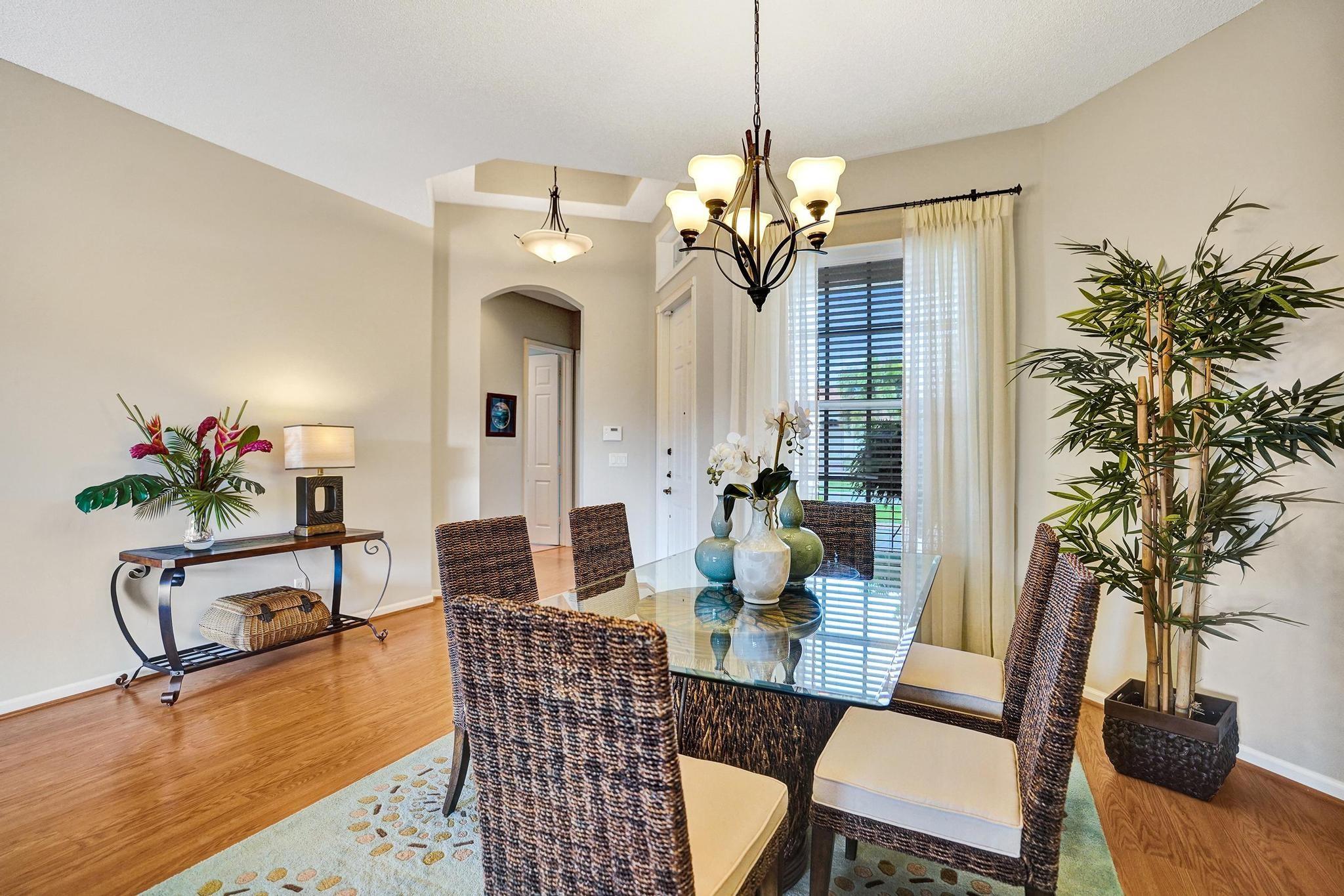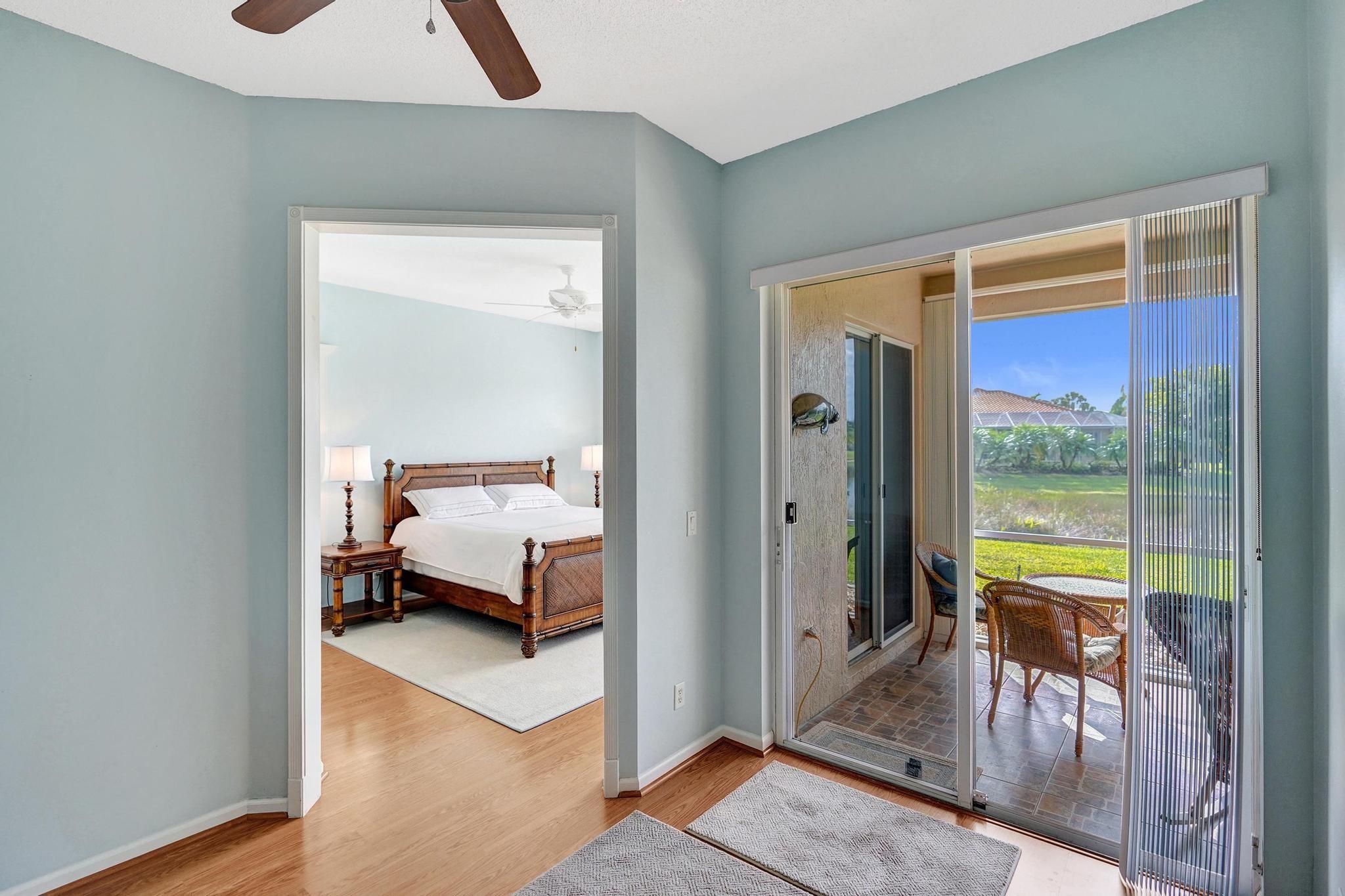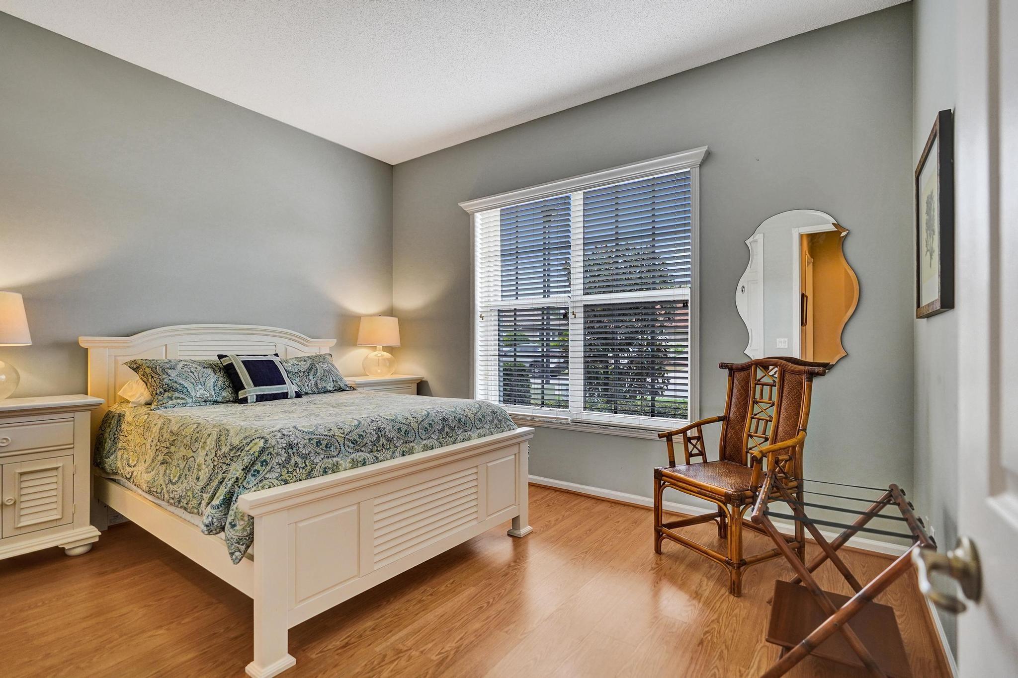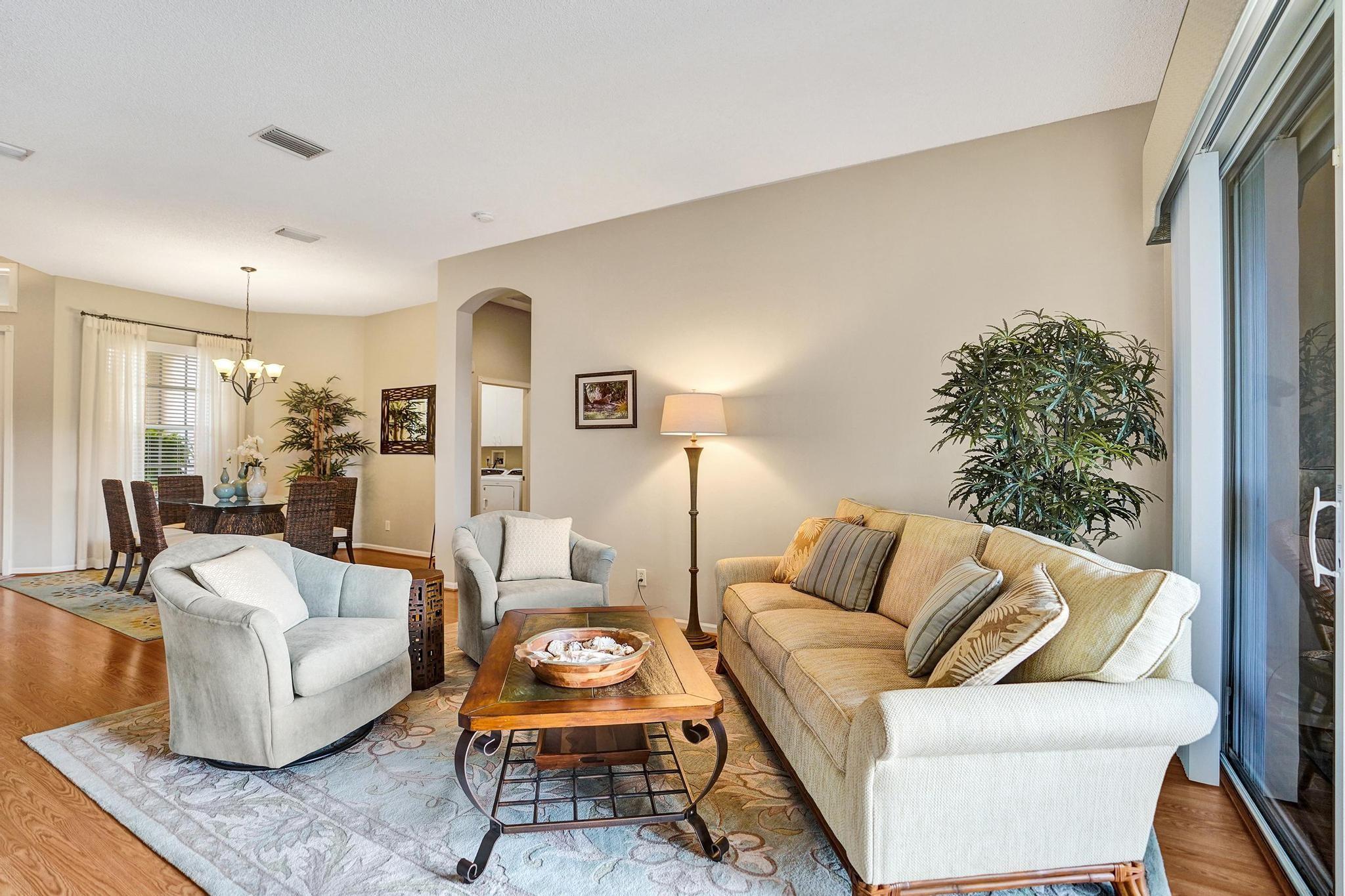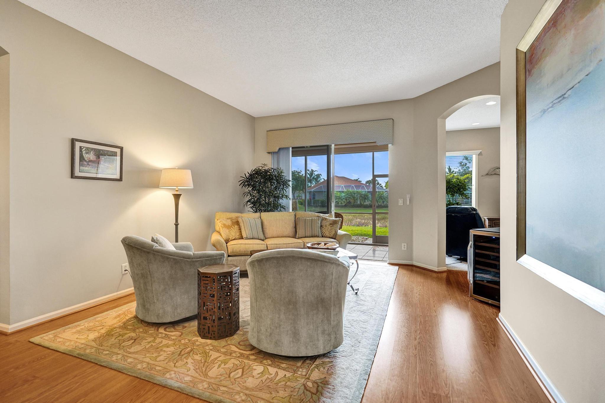 Beautiful 4BR/2BA/2CG in pristine Sandhurst 55+ community. New roof in 2025 & freshly painted exterior. Volume ceilngs into formal dining & living area. Cozy family rm & spacious kitchen w/cooking island & tons of cabinet space. Split BR flr plan. Walk-in closet & priv. bath w/sep. shower & roman tub in primary. 4th BR utilized as den off the primary is perfect home office space w/water view. Screened patio. Sep. laundry rm. Accordion shutters. Well maintained community is sought after for low HOA, offering a renovated clubhouse, sparkling pool, hot tub, fitness center, tennis court & security gated entry. No weight limit on pets! Publix is just next door & close to many public & priv. club membership golf courses. Quick ride to gorgeous tropical beaches, sun & fun, nightlife & shopping.