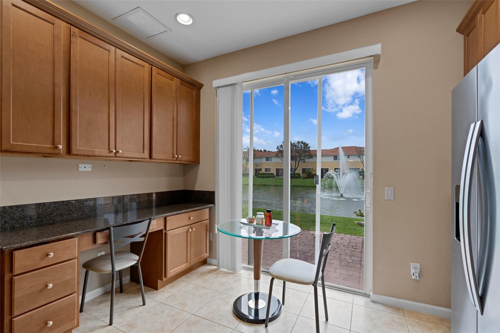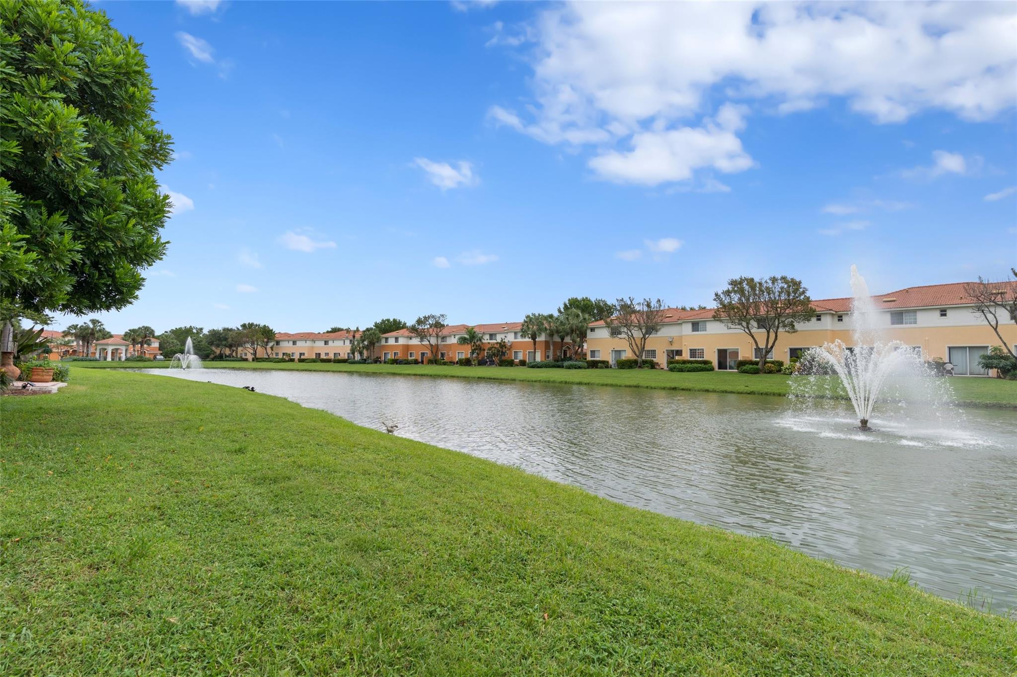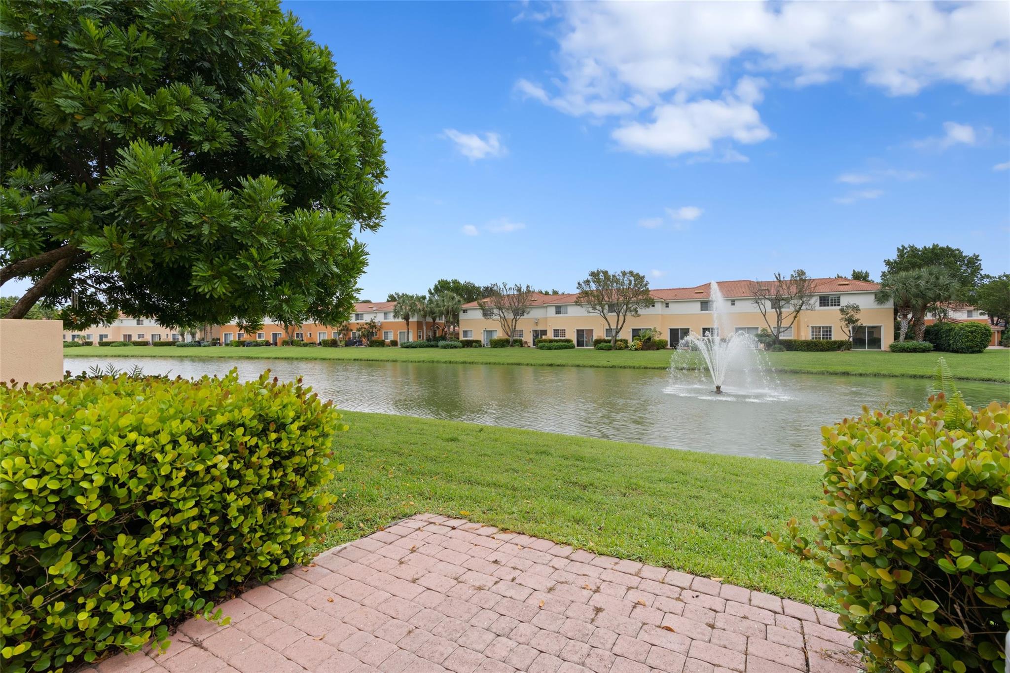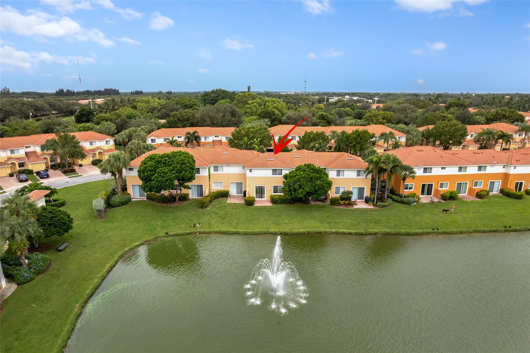 Enjoy the lake and fountain view in this beautiful 3 bed with 3 full bath town home. All bedrooms have an en-suite bathroom, and fabulous California Closets. Kitchen has new appliances (2021), a custom workstation, granite counter tops and a view of the lake across the extended patio. Windows and garage door are impact, AC is 2020. Flooring is ceramic tile and engineered flooring (no carpets). Primary bedroom, second bedroom plus laundry on the second floor, one bedroom on the 1st floor.Garage has epoxy flooring and built ins, while there is parking for four cars on the drive. Low HOA includes exterior maintenance, alarm, lovely community pool, tennis, basketball, renovated gym and clubhouse.(photographs are temporary - professional photos to follow)