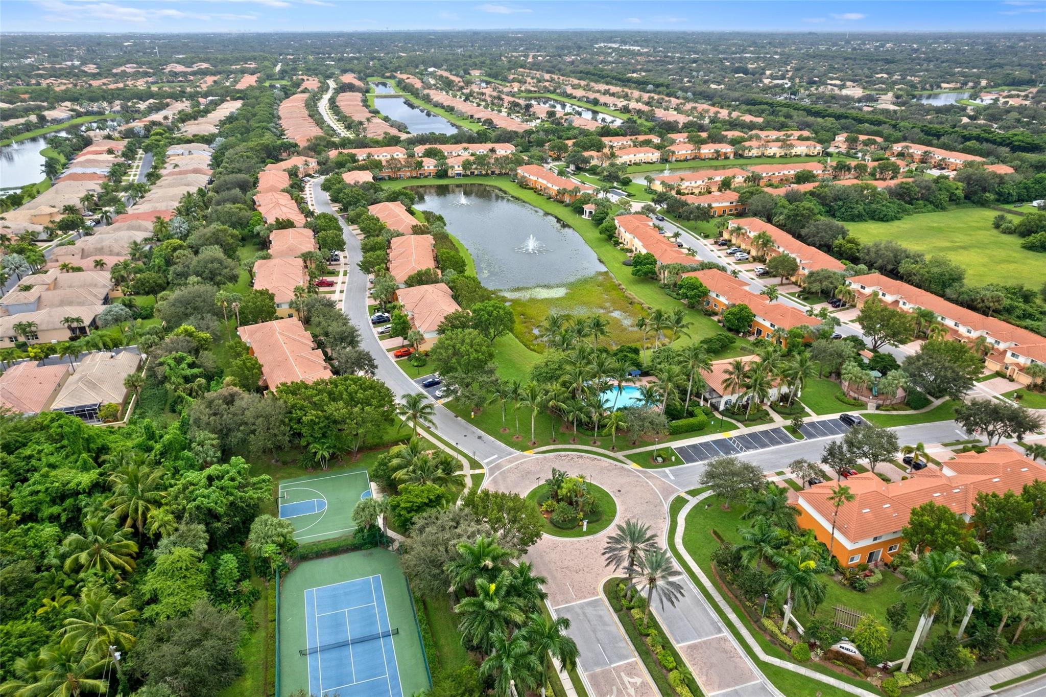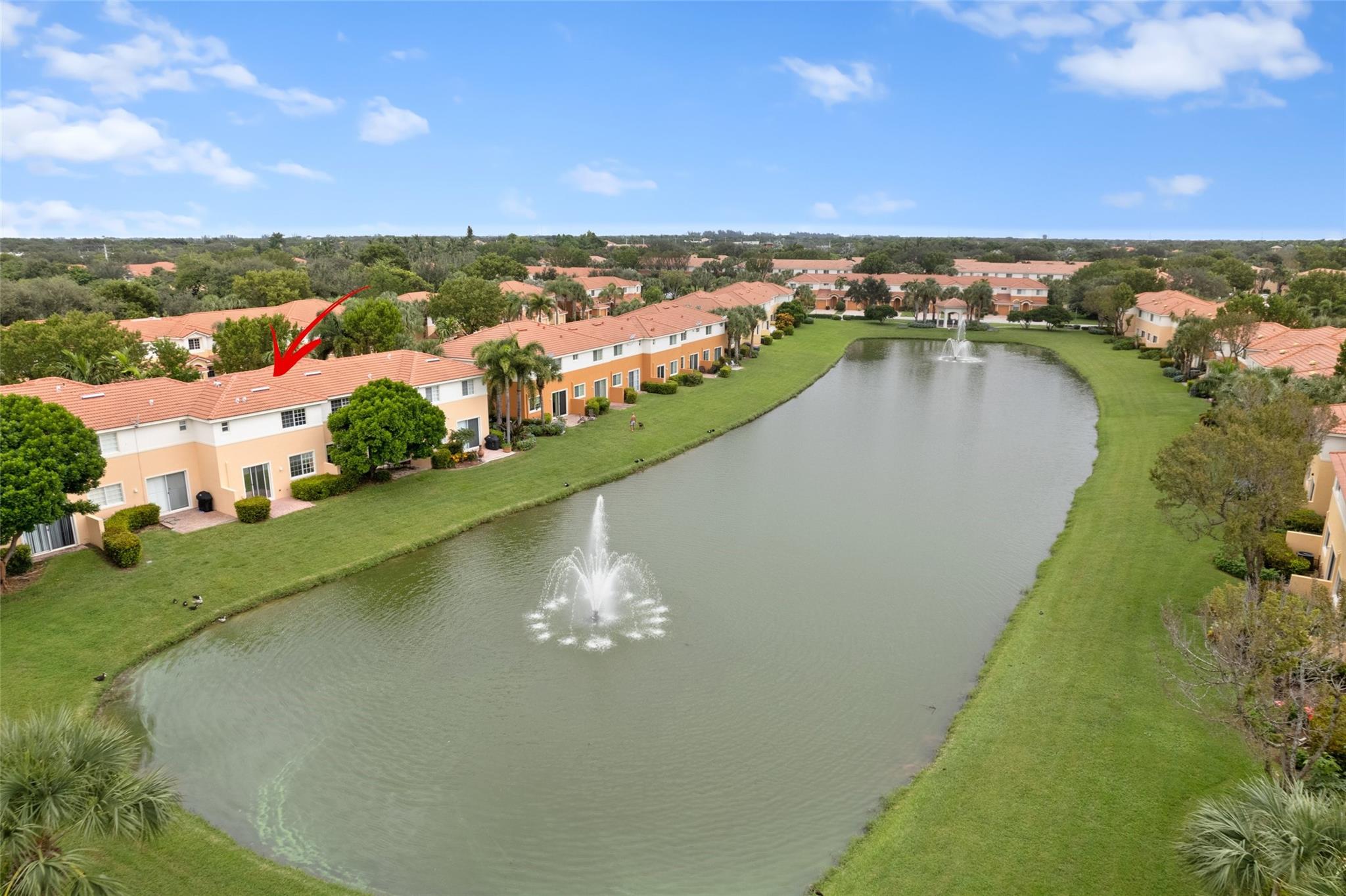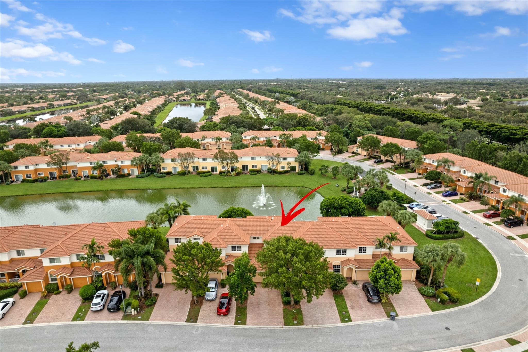 Enjoy the lake and fountain view in this beautiful 3 bed with 3 full bath town home. All bedrooms have an en-suite bathroom, and fabulous California Closets. Kitchen has new appliances (2021), a custom workstation, granite counter tops and a view of the lake across the extended patio. Windows and garage door are impact, AC is 2020. Flooring is ceramic tile and engineered flooring (no carpets). Primary bedroom, second bedroom plus laundry on the second floor, one bedroom on the 1st floor.Garage has epoxy flooring and built ins, while there is parking for four cars on the drive. Low HOA includes exterior maintenance, alarm, lovely community pool, tennis, basketball, renovated gym and clubhouse.(photographs are temporary - professional photos to follow)