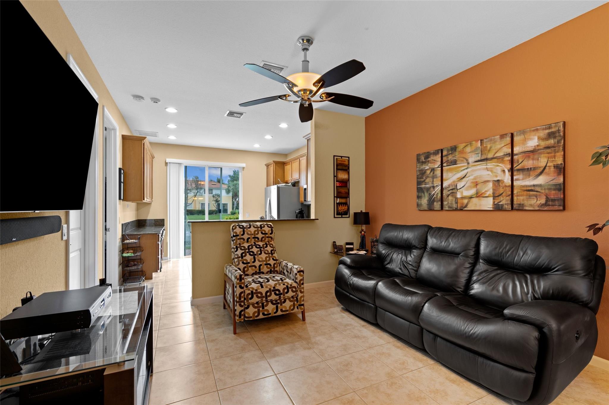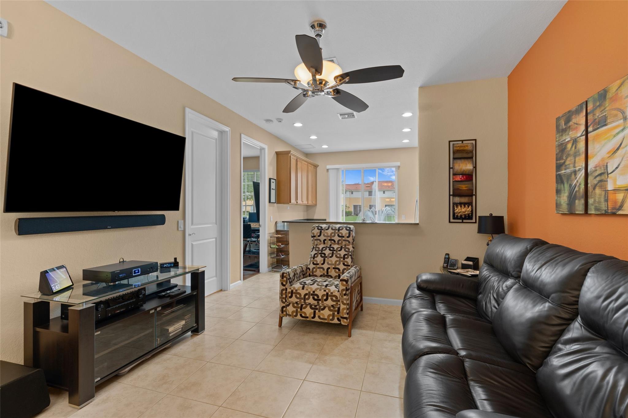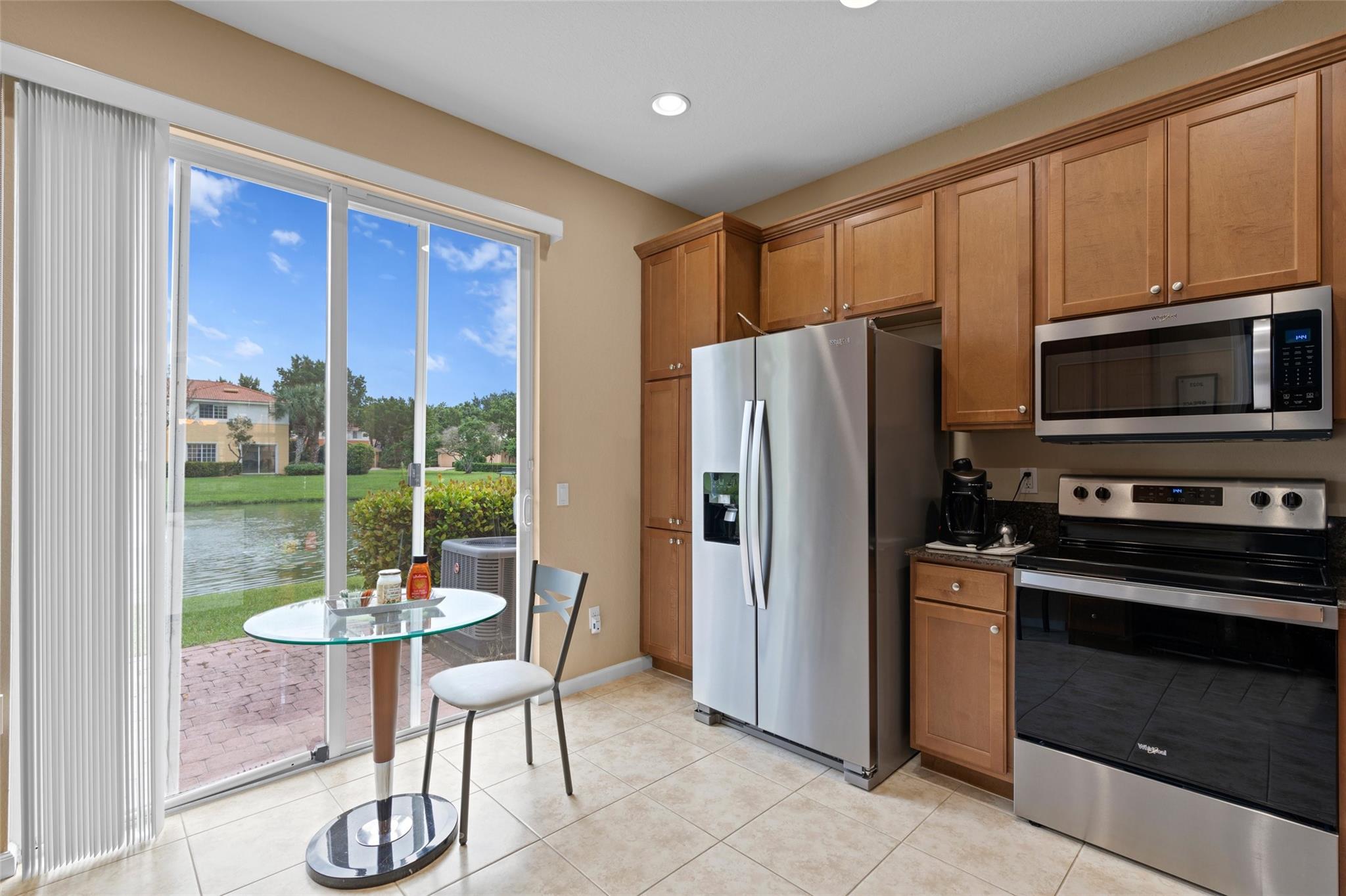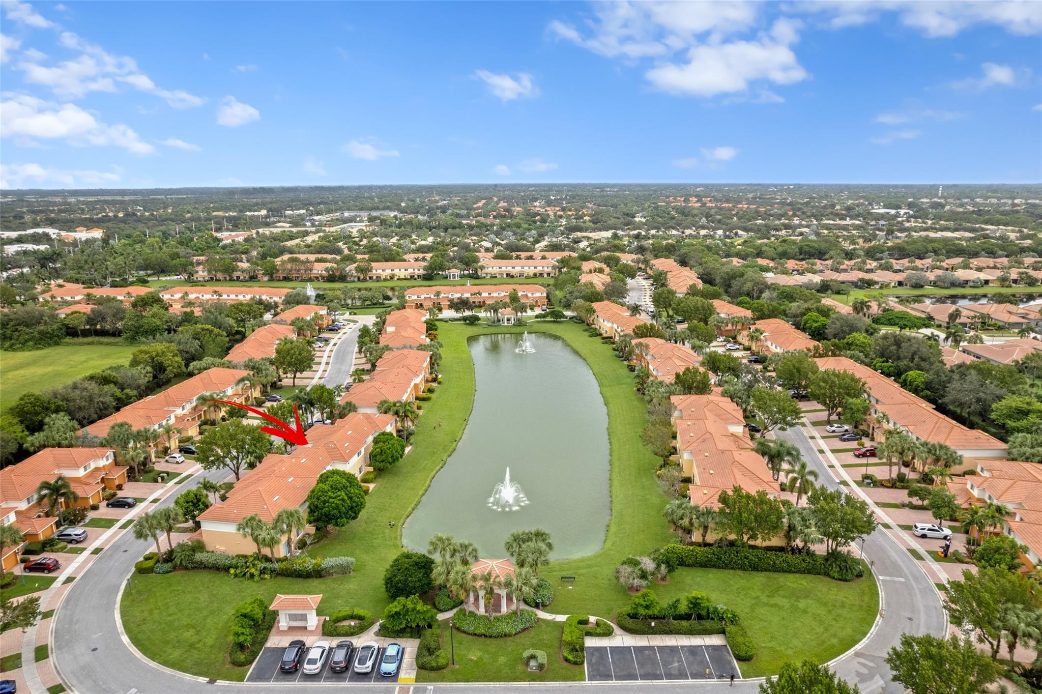 Enjoy the lake and fountain view in this beautiful 3 bed with 3 full bath town home. All bedrooms have an en-suite bathroom, and fabulous California Closets. Kitchen has new appliances (2021), a custom workstation, granite counter tops and a view of the lake across the extended patio. Windows and garage door are impact, AC is 2020. Flooring is ceramic tile and engineered flooring (no carpets). Primary bedroom, second bedroom plus laundry on the second floor, one bedroom on the 1st floor.Garage has epoxy flooring and built ins, while there is parking for four cars on the drive. Low HOA includes exterior maintenance, alarm, lovely community pool, tennis, basketball, renovated gym and clubhouse.(photographs are temporary - professional photos to follow)