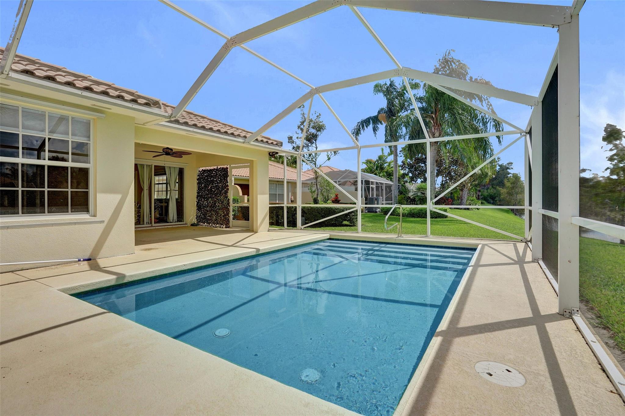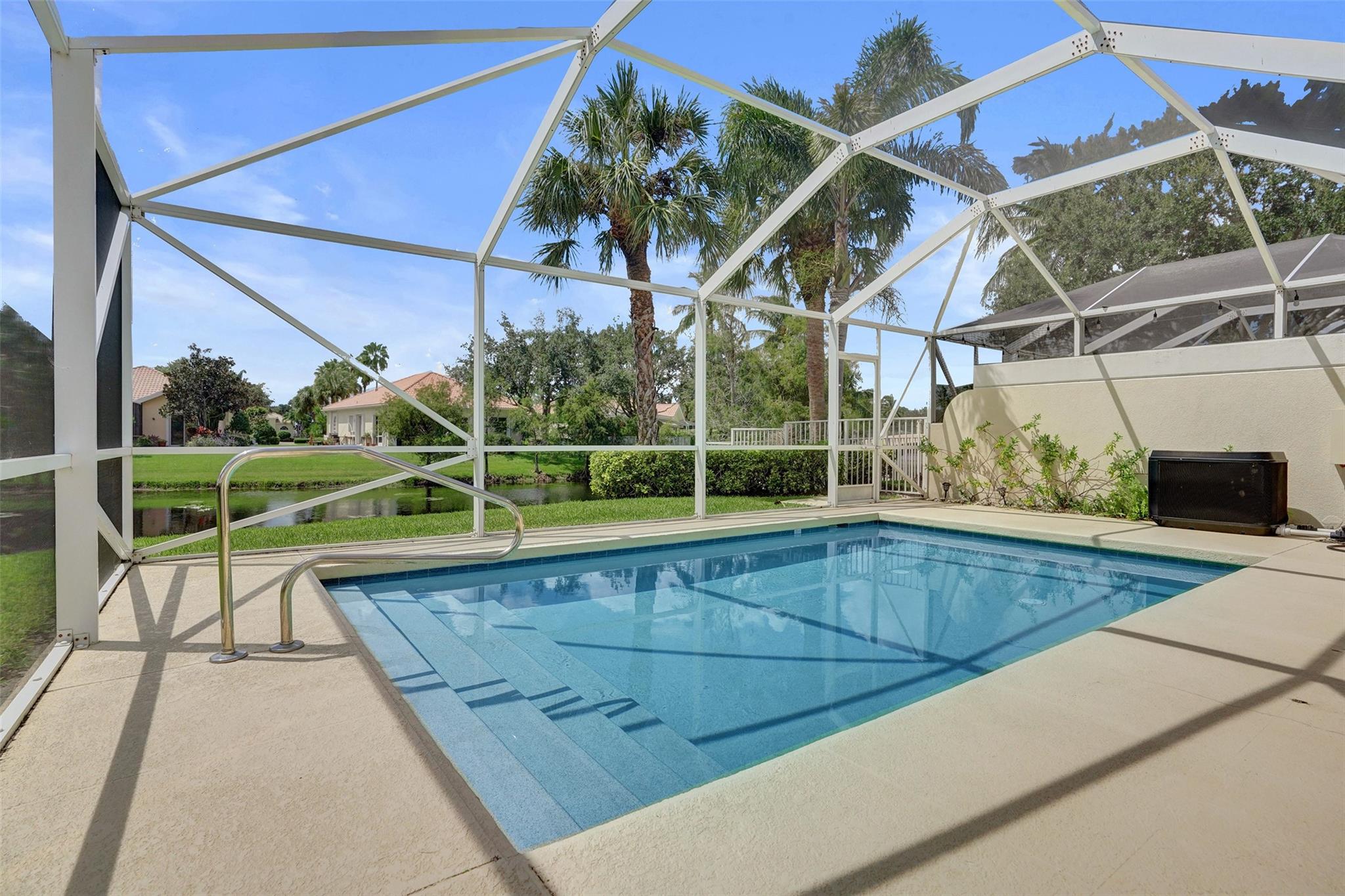 Welcome home. This one has it all. Country Club living at its finest, without the high membership fees. 2/2 with a beautiful heated private pool. Shaded sitting area and screened in to enjoy the pool all year round. High Vaulted ceilings inside give this villa a grand open feel. Wide open kitchen has views straight out to the pool and canal. Split bedroom has a multi-primary suite feel. Awesome laundry room with brand new washer and dryer. Lots of storage as well. The amenities in this complex are fantastic. This is a highly desirable layout and ready for you to move in.