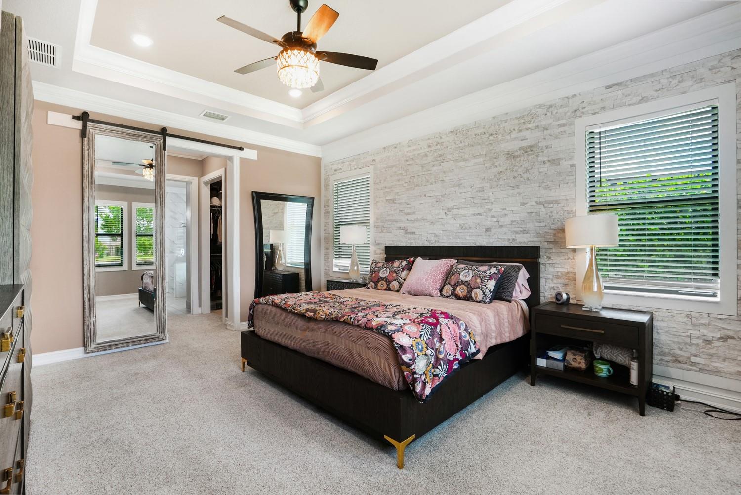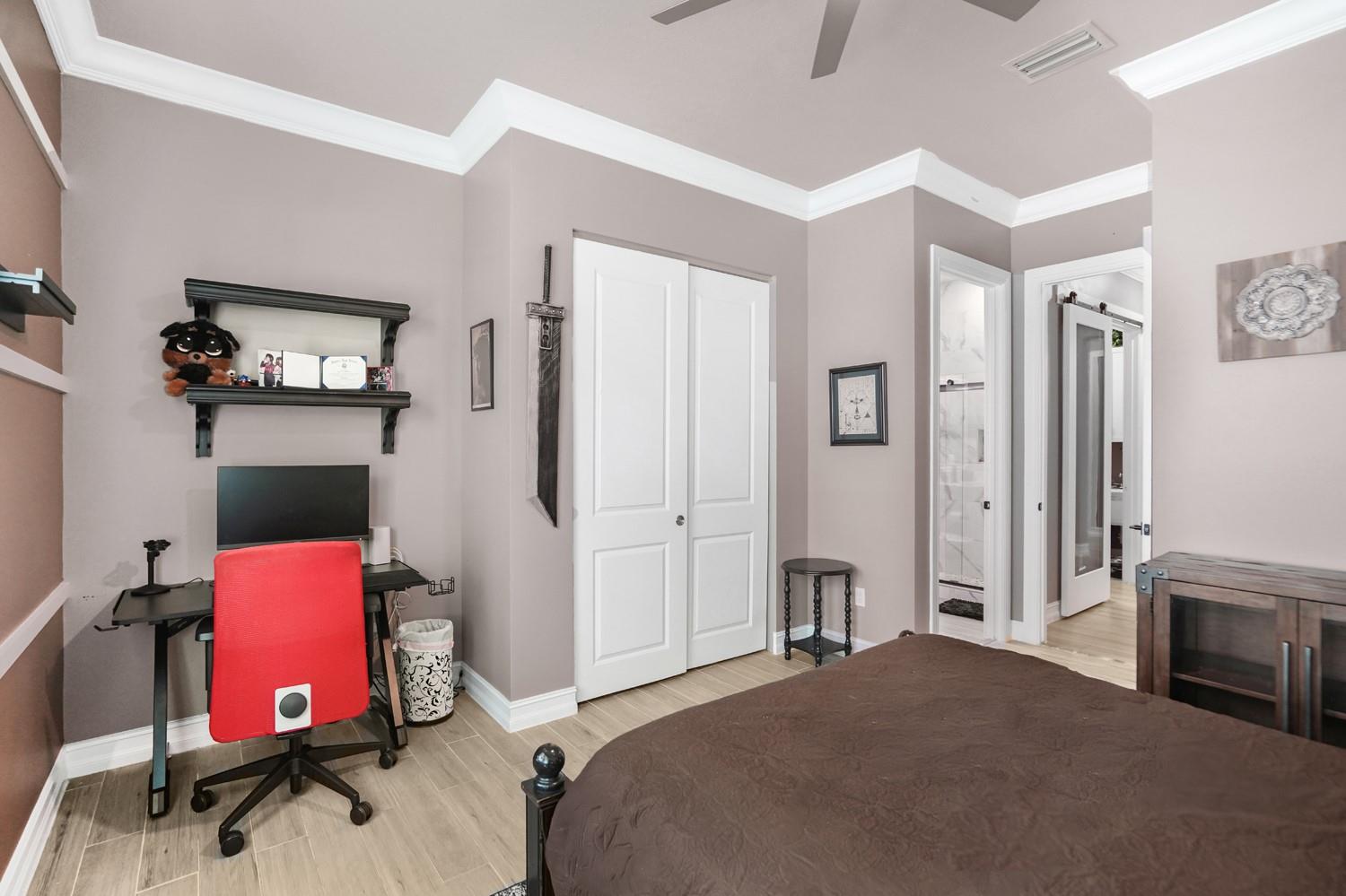 Beautifully UPGRADED home in desirable Palm Meadows! This meticulously maintained residence features a whole-house generator, gas stove, custom barn doors and cubbies in the laundry room, and a new kitchen island with granite, sink, faucet, and backsplash. All closets and pantry were redesigned by The Closet Factory. Interior has fresh paint, upgraded door and cabinet hardware, stylish wallpaper, and a rock accent wall in the bedroom. Bathrooms include new shower heads, barn-style glass doors, updated faucets, and a renovated guest bath. Enjoy a screened-in porch, new island lighting, ceiling fans, new washer/dryer, new AC unit, EV outlet in garage, and termite warranty. Move-in ready with thoughtful upgrades throughout!