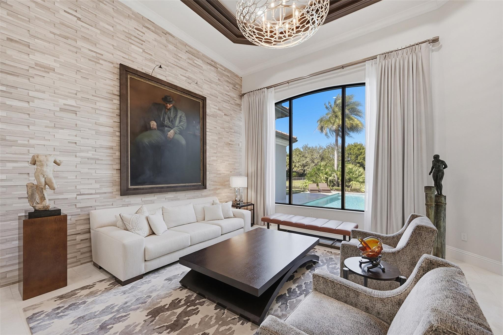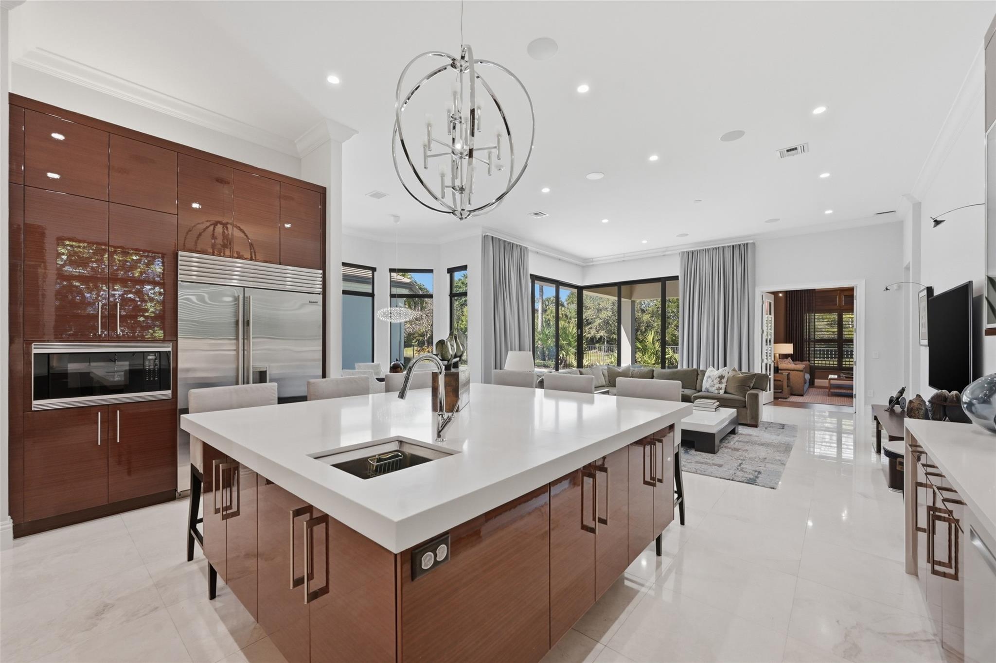 Walk into sophisticated living in this magnificent Turn Key, professionally designed modern masterpiece. A Belvedere Extended model, is 4,956 SF under air, on 1/2 acre waterfront paradise. The grand entry unfolds 4 BR/ 5 1/2 BA, Library or 5th BR + OFFICE with stylish custom finishes, an indoor/outdoor lifestyle overlooking picturesque views. Relax in the resort styled pool & lanai complete with a summer kitchen in total privacy from neighbors. The open plan is elevated with professionally designed furnishings, window coverings & custom wall paper creating the perfect furnished home; Turn Key & Move in ready. Seven Bridges boasts a resort lifestyle with unmatched amenities for vibrant people of all ages: Clubhouse, Pools, Playground, Restaurant, Tennis/Pickleball & Social Clubs.